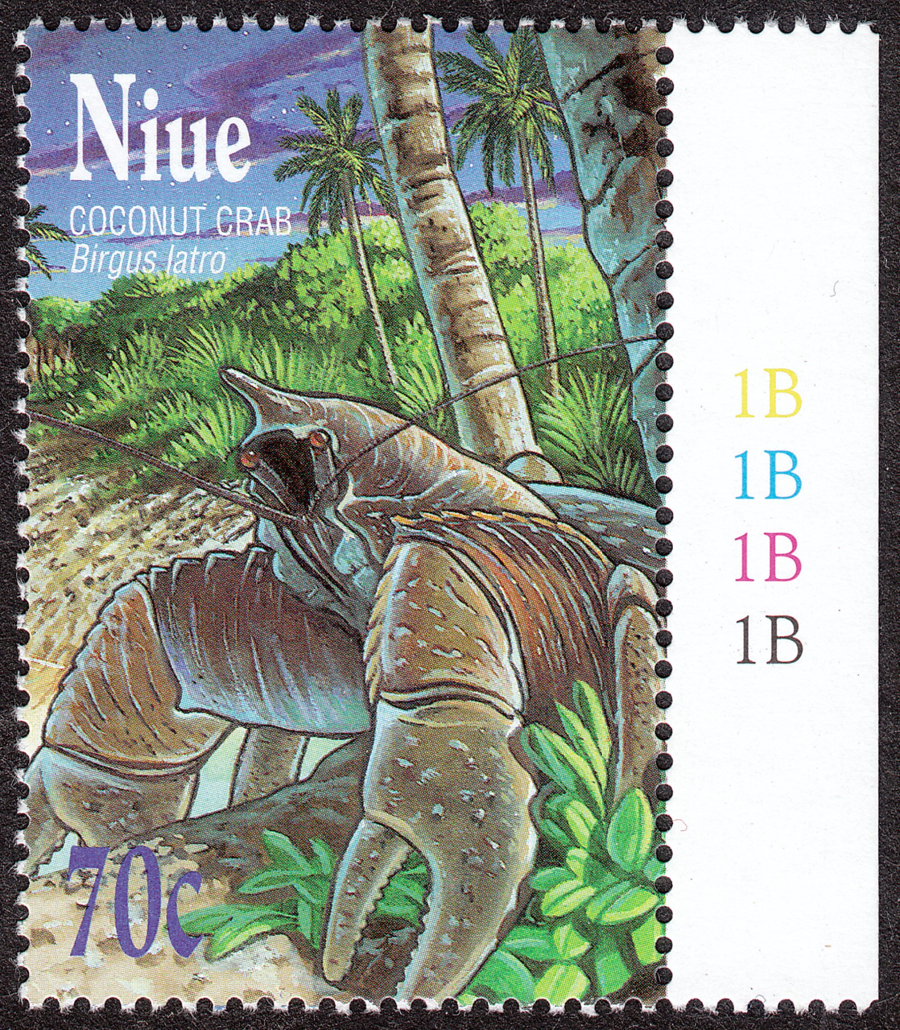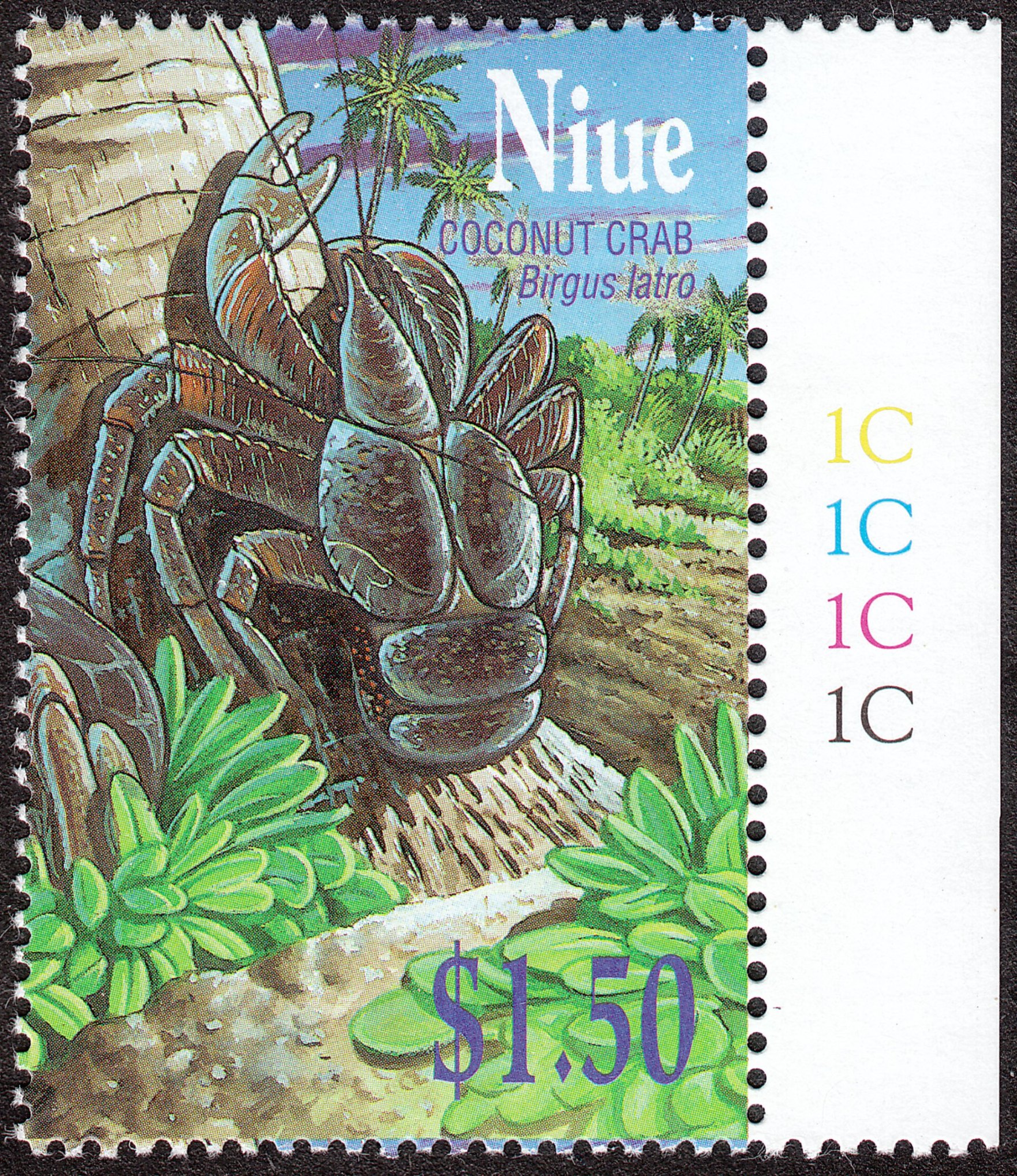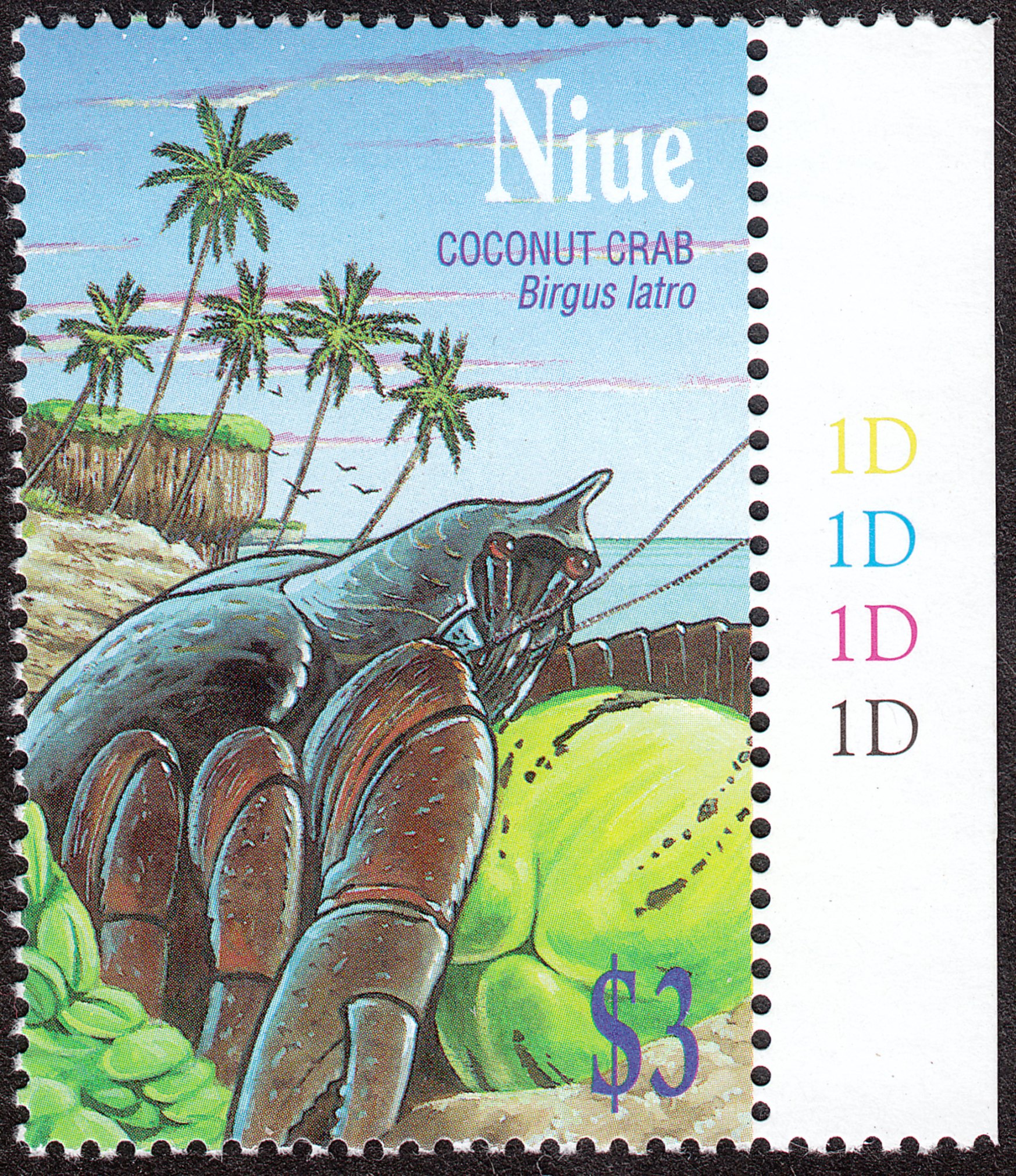 Hier ein Satz von vier Werten mit dem Palmendieb, dem größten an Land lebenden Krebstier der Erde, herausgegeben auf Niue: