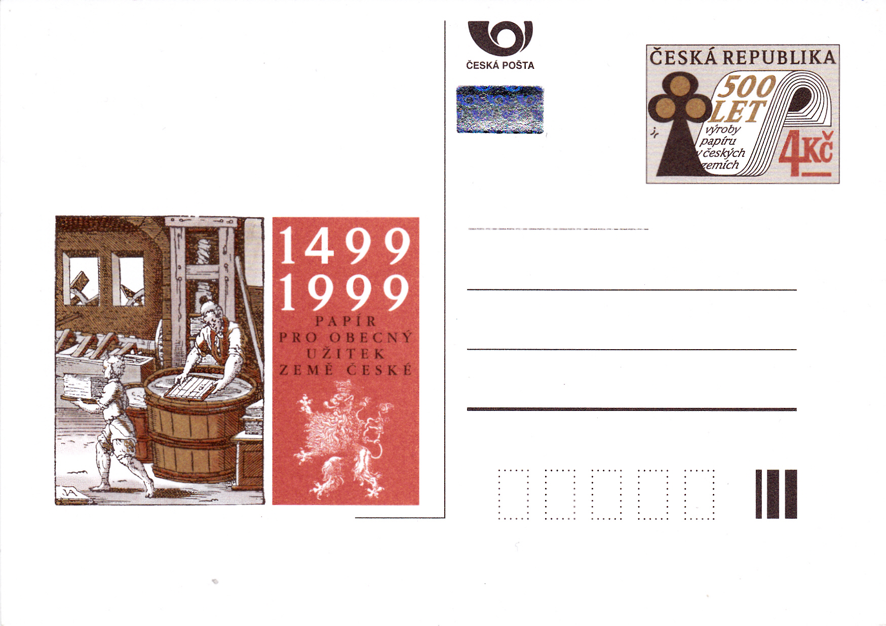 Diese Postkarte aus der Tschechische Republik zeigt im Wertstempel zum Thema "500 Jahre Papierherstellung in den tschechischen Ländern" einen stilisierten Baum und Papierbahnen. Die Illustration auf der Karte zeigt "Der Papyrer" aus Jost Ammans Ständebuch aus dem Jahre 1568.