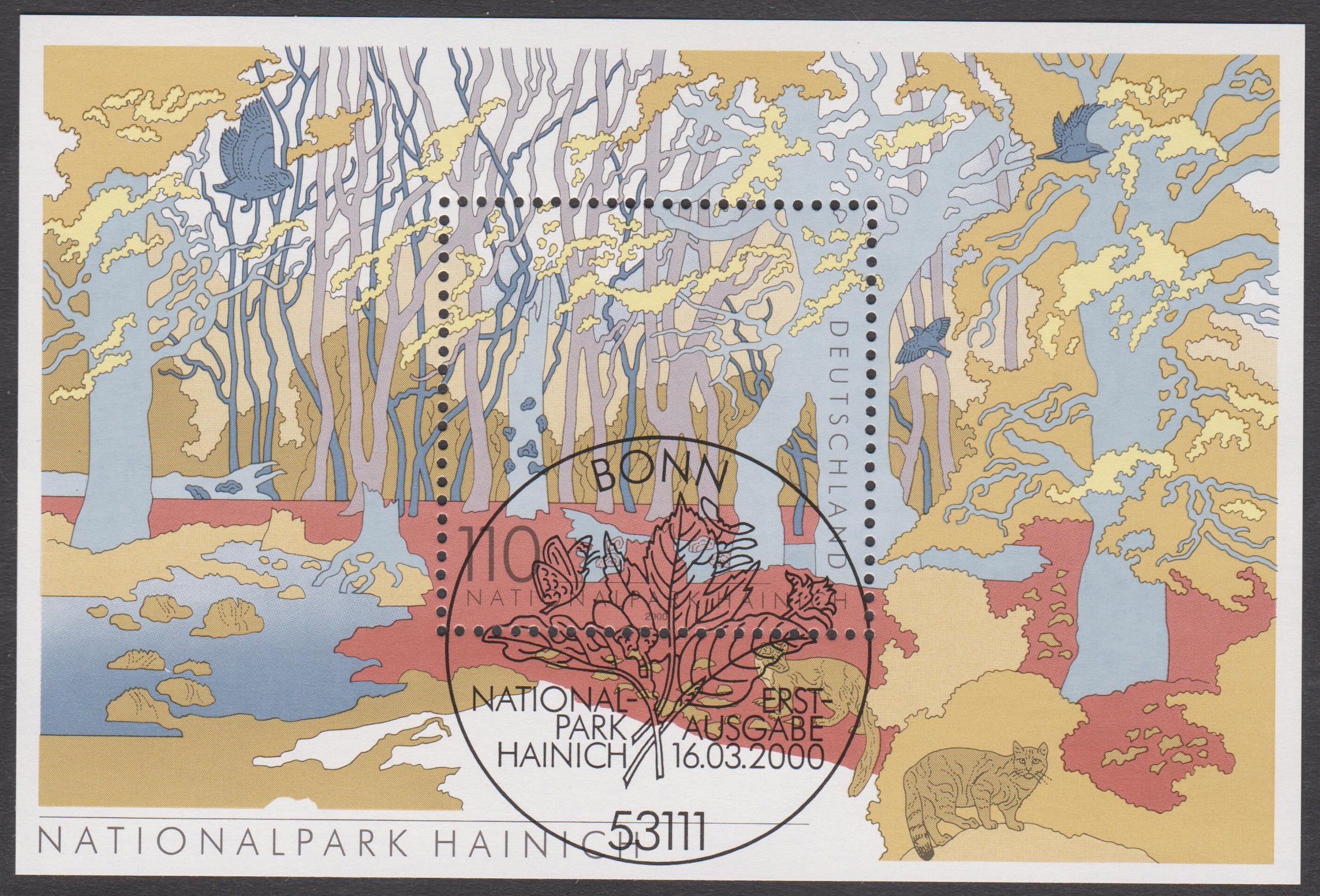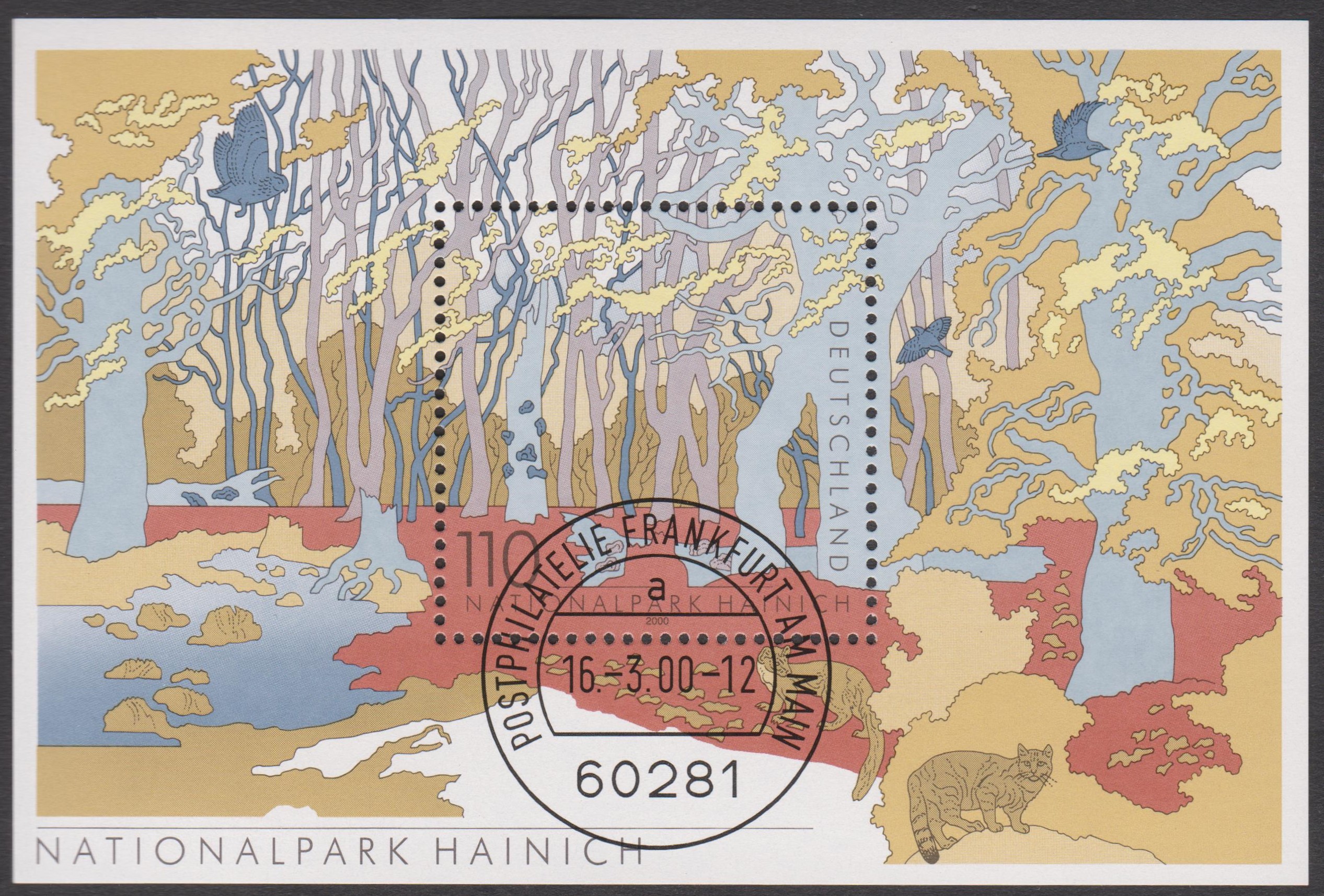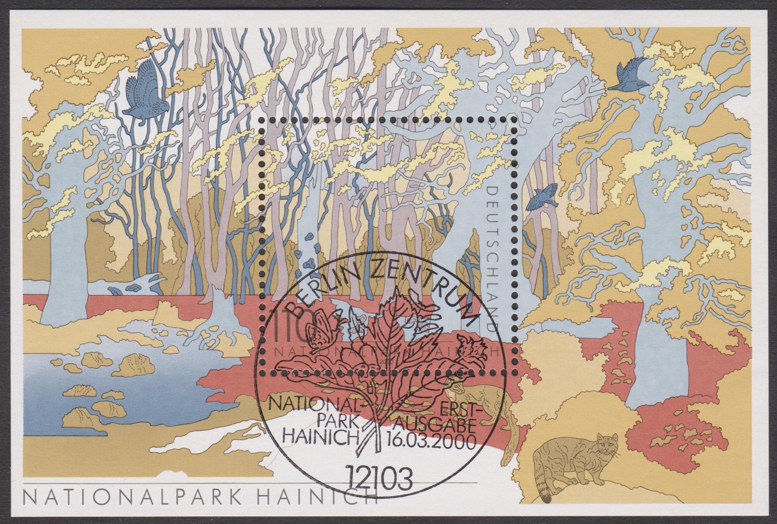 Bund Block 52 zeigt den Nationalpark Hainich, hier am Ersttag. 16.03.2000, gestempelt "POSTPHILATELIE FRANKFURT AM MAIN":