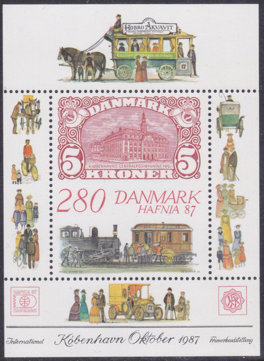 Zur Internationalen Briefmarkenausstellung HAFNIA ’87 in Kopenhagen ist diese Marke (MiNr 900) mit der Marke Dänemark MiNr. 66 im oberen Teil der Marke und einer Lokomotive mit Bahnpostwagen im unteren Teil.