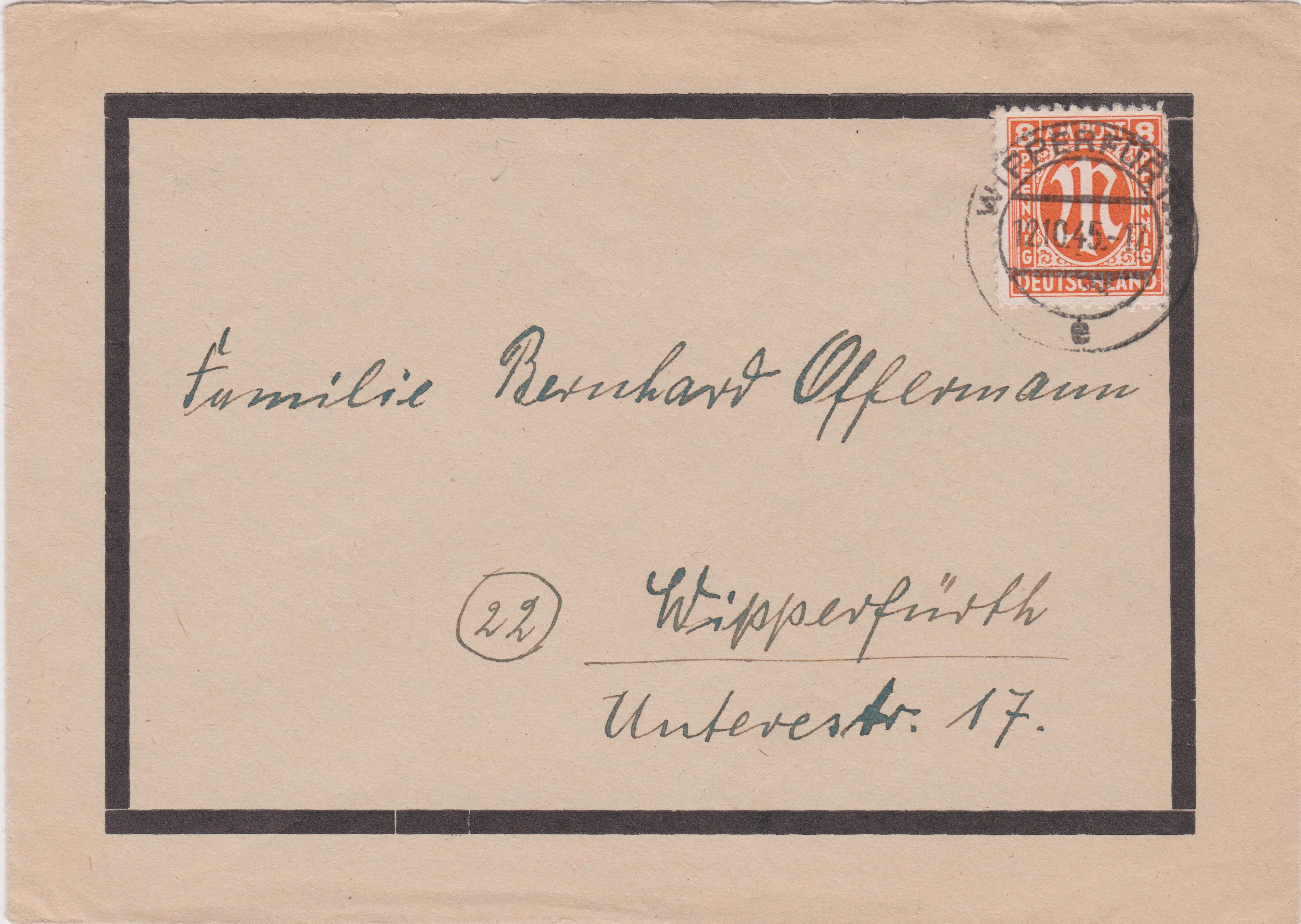 Zwei Ortsbriefe aus WIPPERFÜRTH aus dem Oktober 1945 mit Einzelfrankaturen 8 Pf AM-Post: