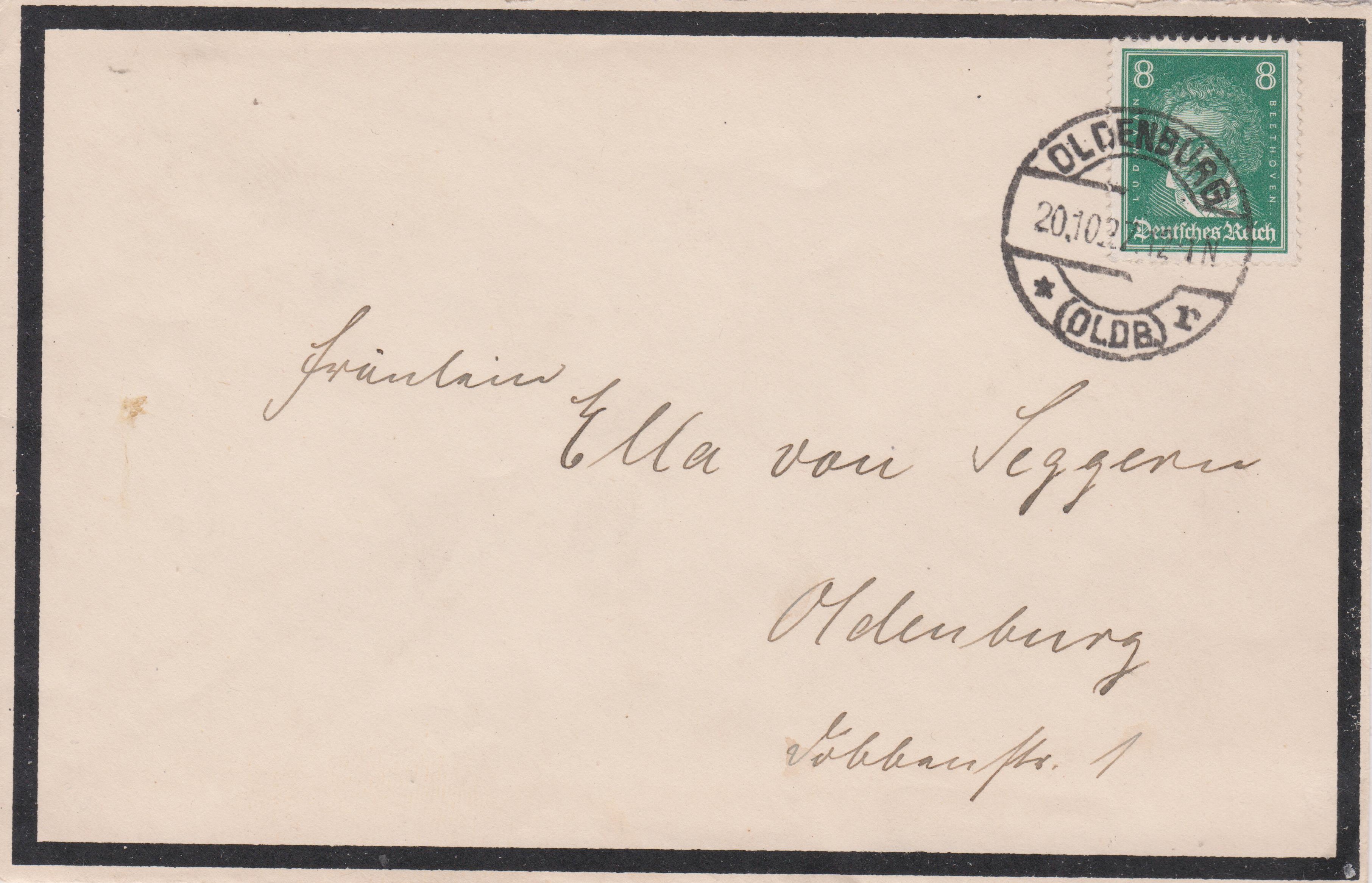 Einzelfrankatur 8 Pf Freimarken: Berühmte Deutsche "Ludwig van Beethoven", Deutsches Reich MiNr. 389, am 20.10.1932 portogerecht auf Trauerbrief, gelaufen im Ortsverkehr von OLDENBURG: