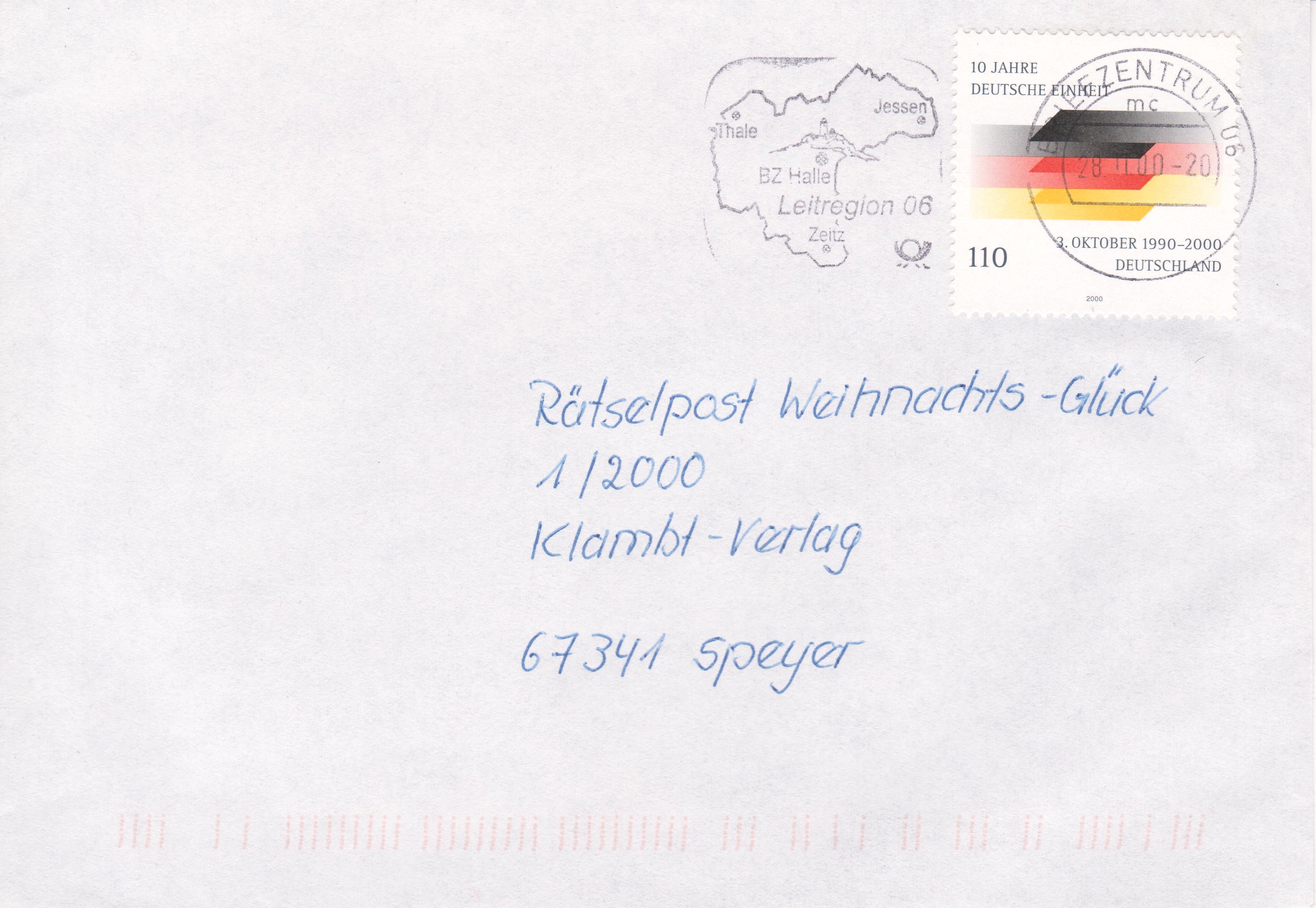 Einzelfrankatur Bund MiNr. 2142 am 28.11.2000 portogerecht auf Standardbrief von BRIEFZENTRUM 06 nach 67341 Speyer mit entsprechender Linearcodierung: