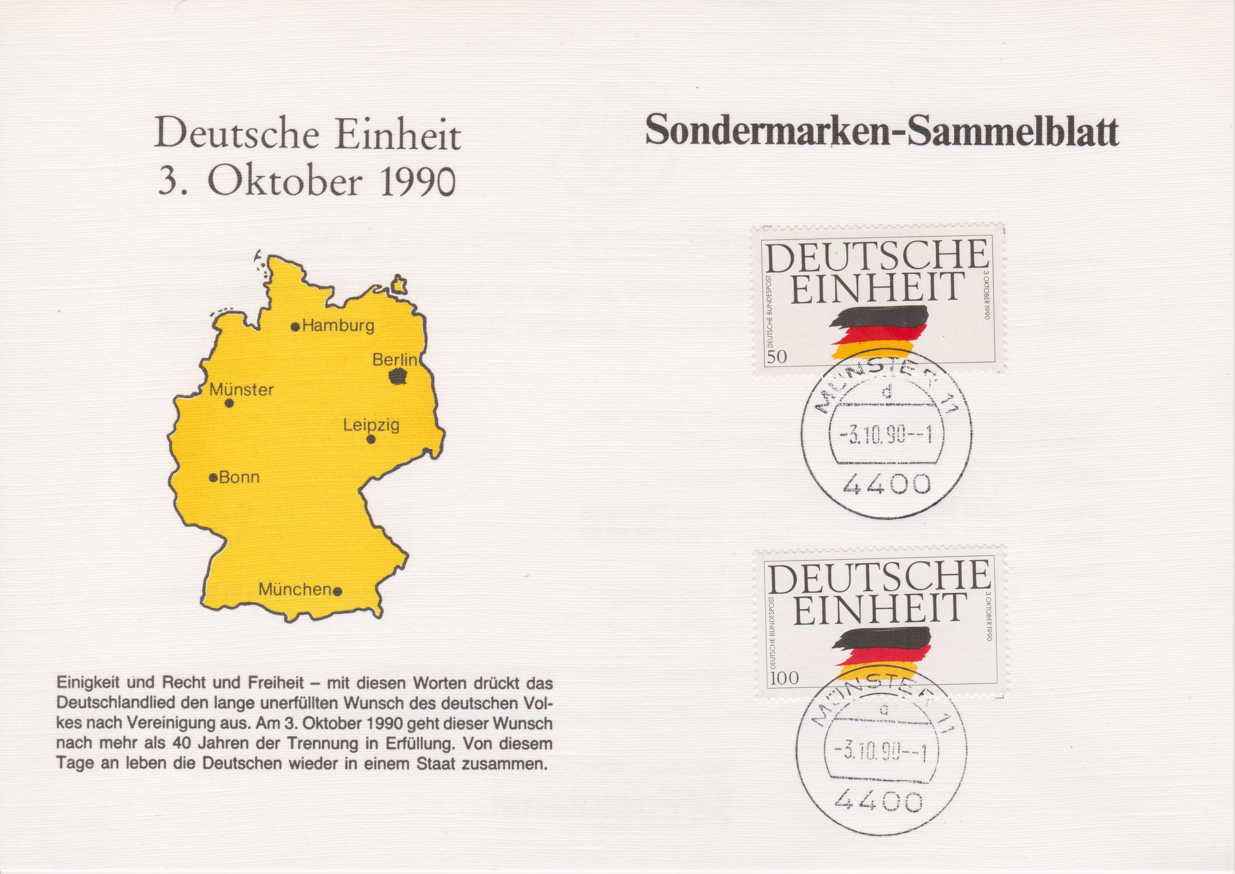 "Sondermarken-Sammelblatt" mit Bund MiNr. 1477 sowie 1478, aufgelegt am 03.10.1990 (= Ersttag beider Postwertzeichen) zum Thema "Deutsche Einheit":