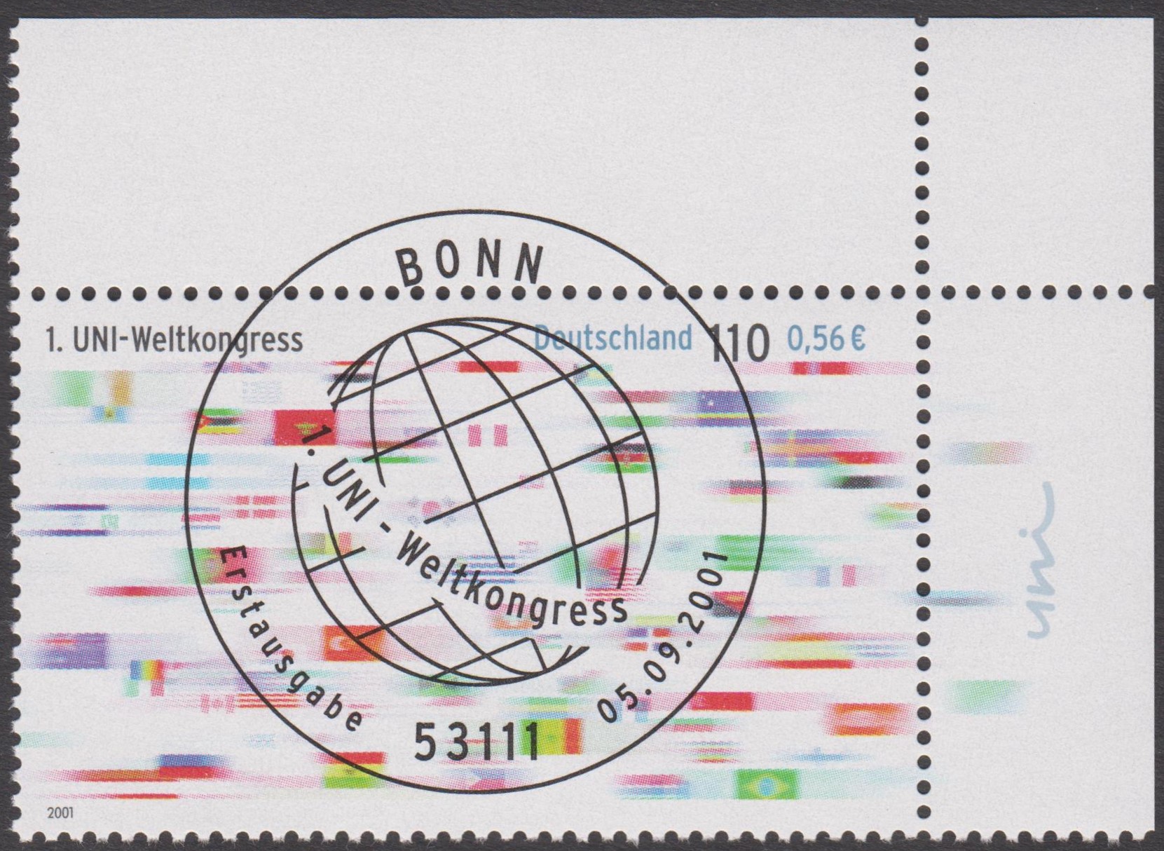 Bund MiNr. 2142, linke obere Ecke des Zehnerbogens (= Feld 1) sowie rechte obere Ecke des Zehnerbogens (= Feld 5) mit ESST BONN: