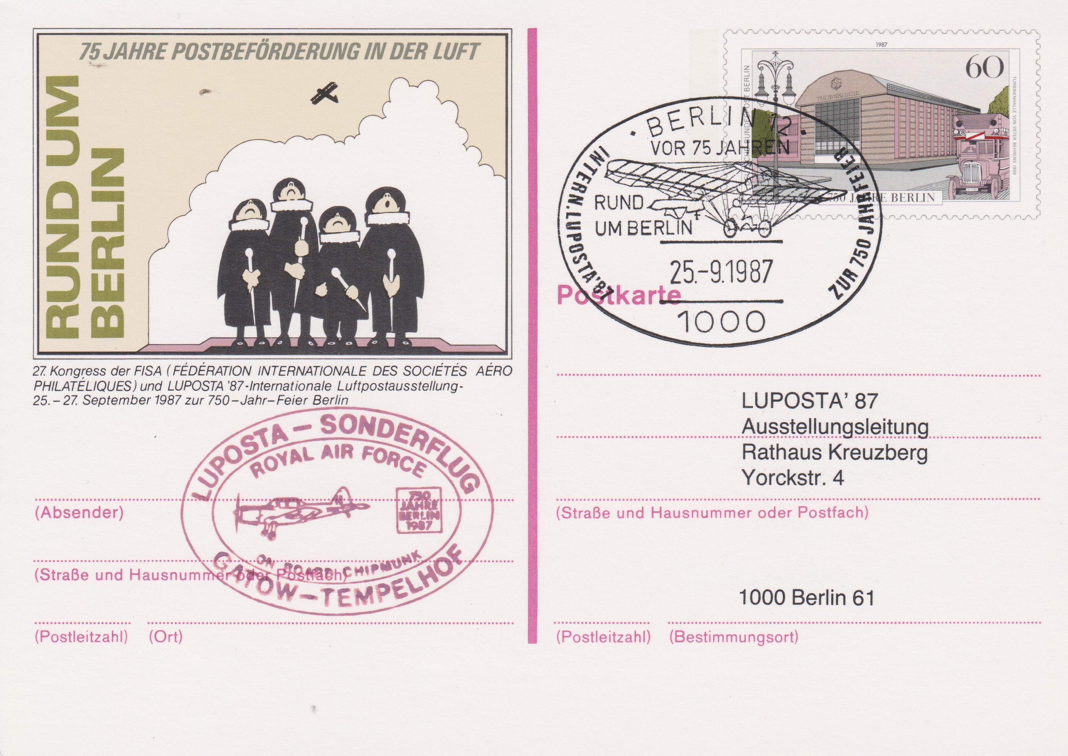 Diese Postkarte wurde am 25.9.1987 per "LUPOSTA-SONDERFLUG" von der Royal Air Force von GATOW nach BERLIN-TEMPELHOF befördert und dort mit den Sonderstempel versehen: