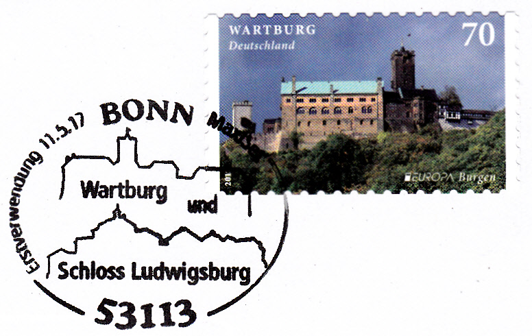 Eckrandstück der Europamarke 2017 mit der Abbildung der Wartburg auf einem Brief vom Ersttag mit dem Ersttagsonderstempel Bonn.