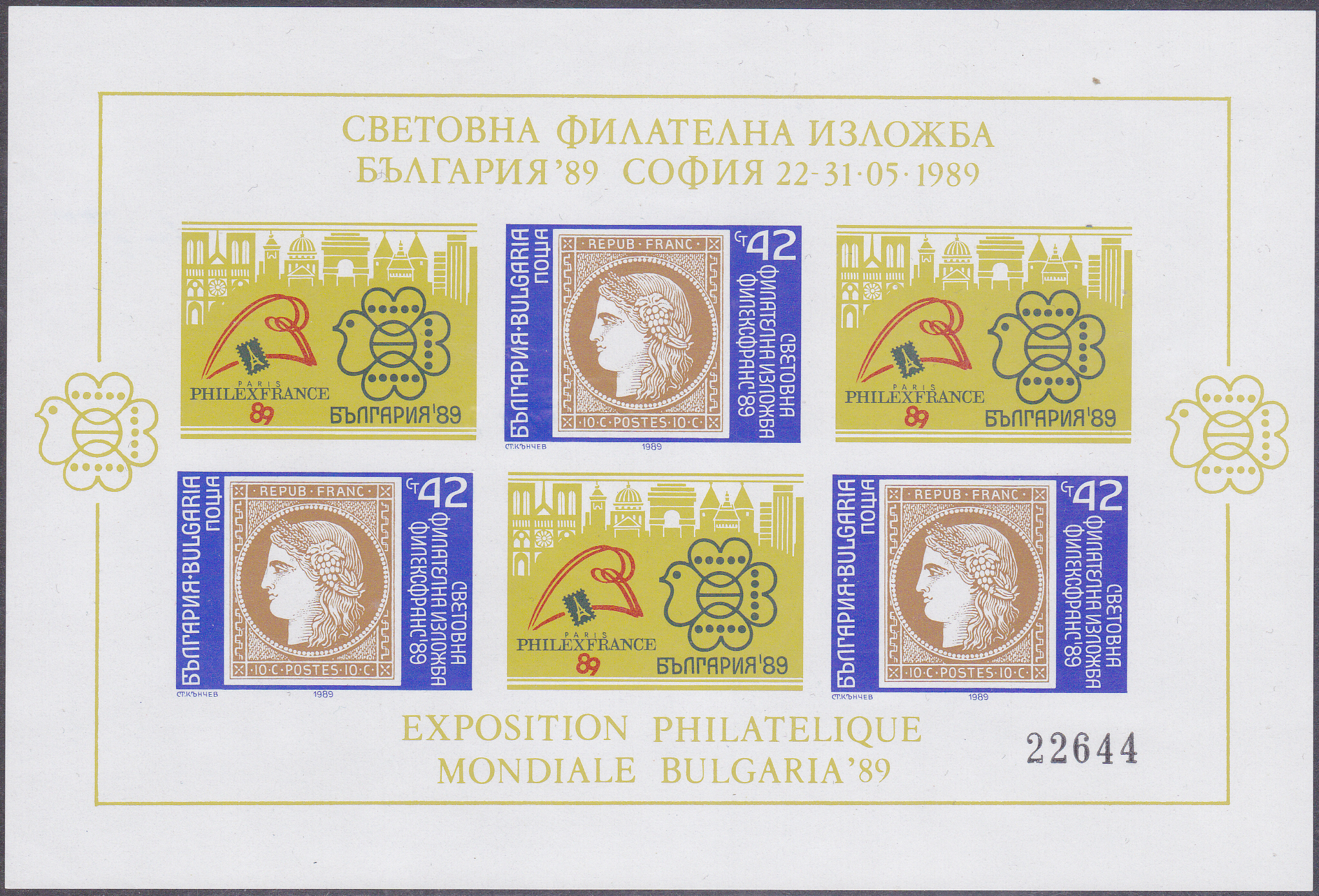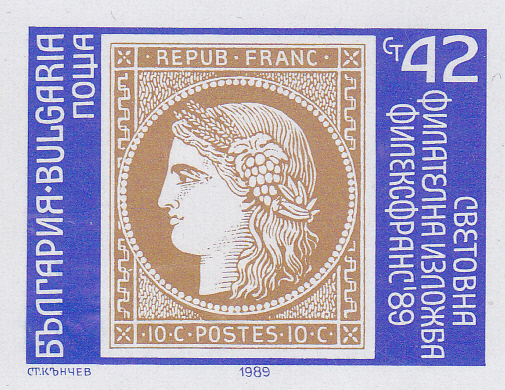 Zur Internationalen Briefmarkenausstellung BULGARIA ’89 in Sofia sind in Bulgarien einige Marken mit Abbildung von Briefmarken erschienen. Diese gibt es gezähnt aus Bogen und auch geschnitten aus Markenblöcken.