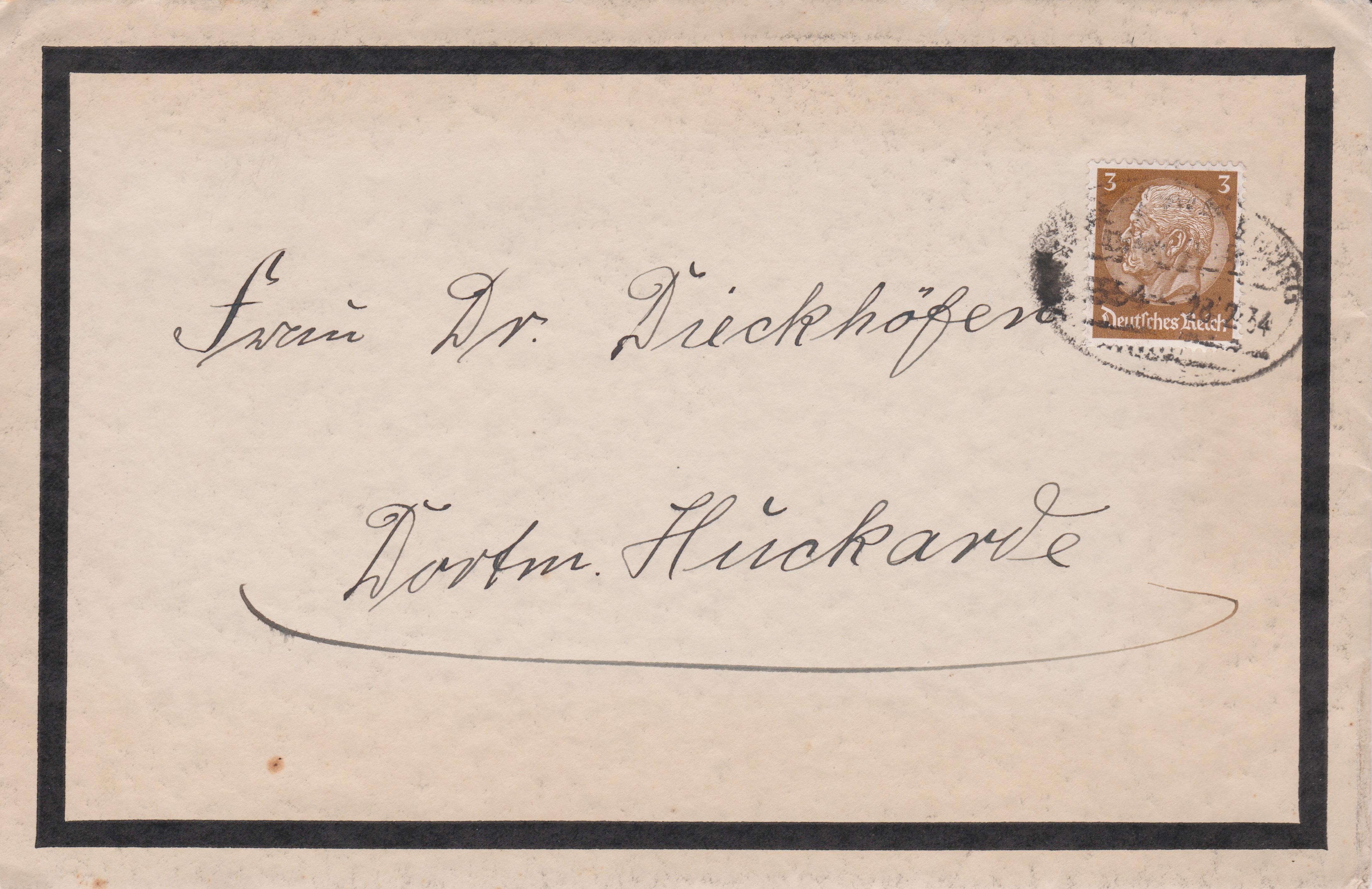 Postkarte im Fernverkehr, Portostufe 6 Pf, in Form einer Ganzsache der Dauerserie Hindenburg mit Trauerrand, aufgegeben am 01.02.1935 in BRUCHSAL, adressiert an eine Fahrradfabrik in "Brackwede-Bielefeld"(= Ernst & Paul Stricker Fahrradfabrik, Brackwede/Bielefeld, 1926 - 1969):