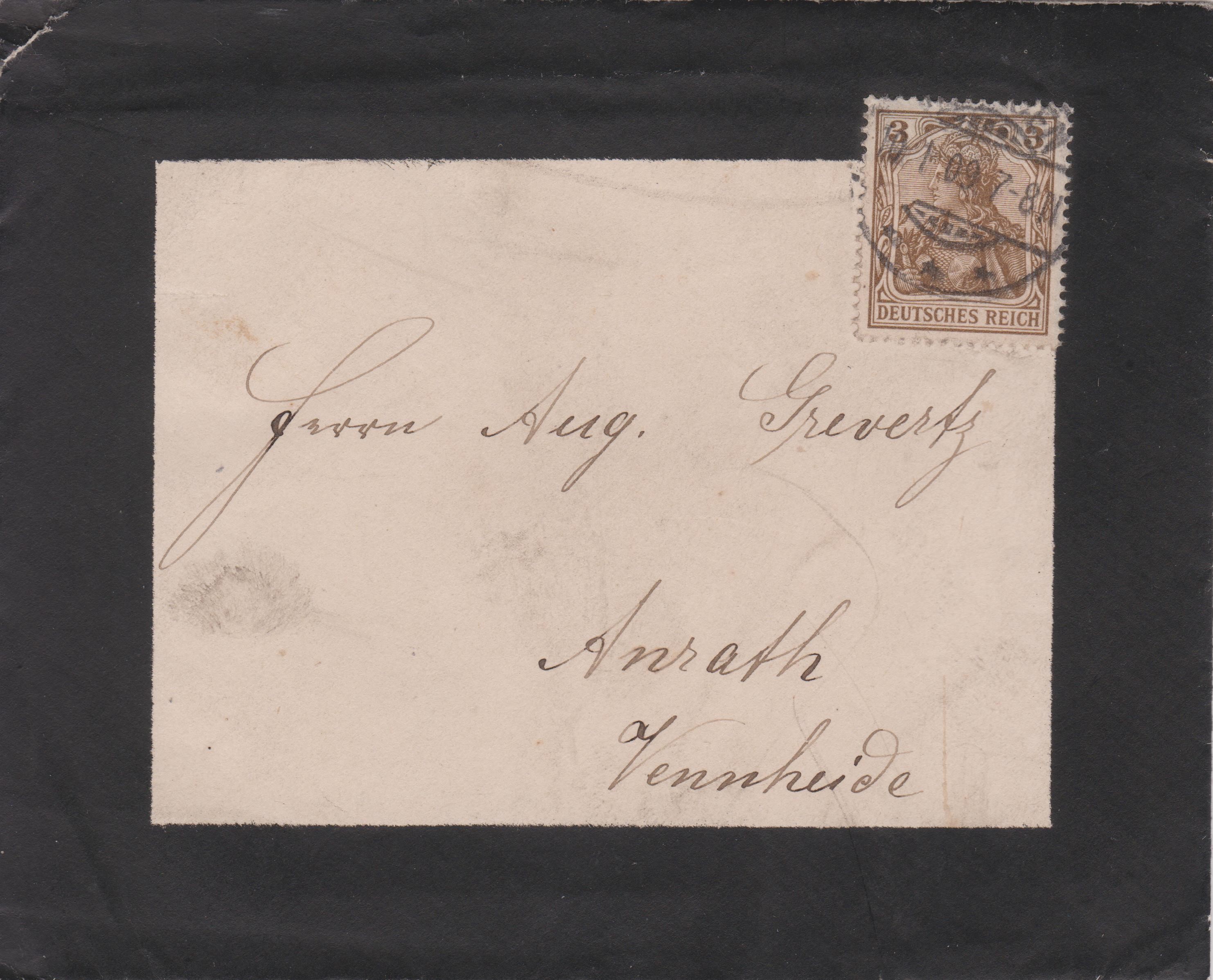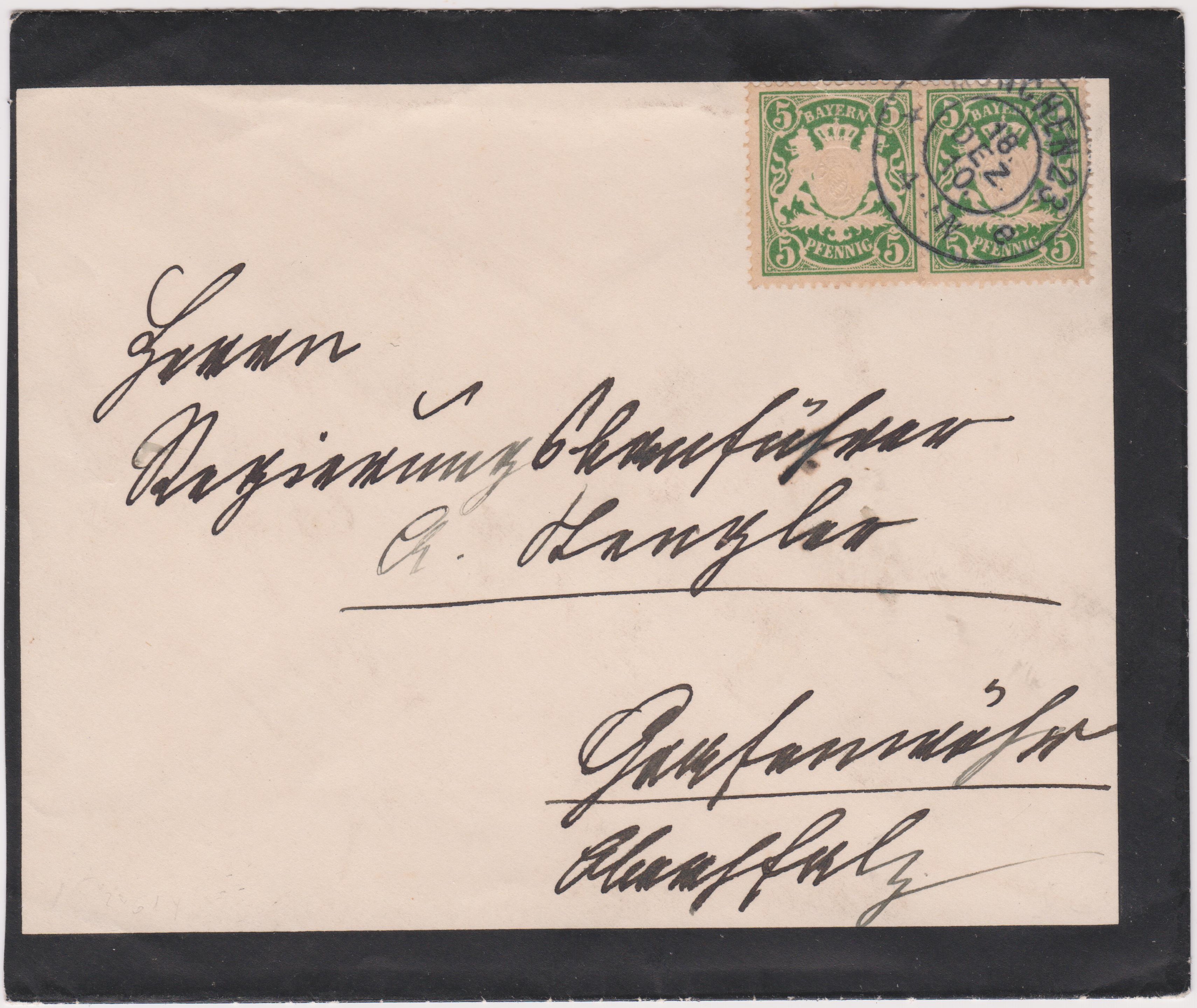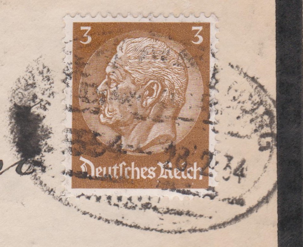 Das Porto für einen Brief im Frnverkehr in Höhe von 12 Pfennig wurde bei der Einlieferung im Postamt bar bezahlt, was ein zweizeiliger Stempel dokumentiert.