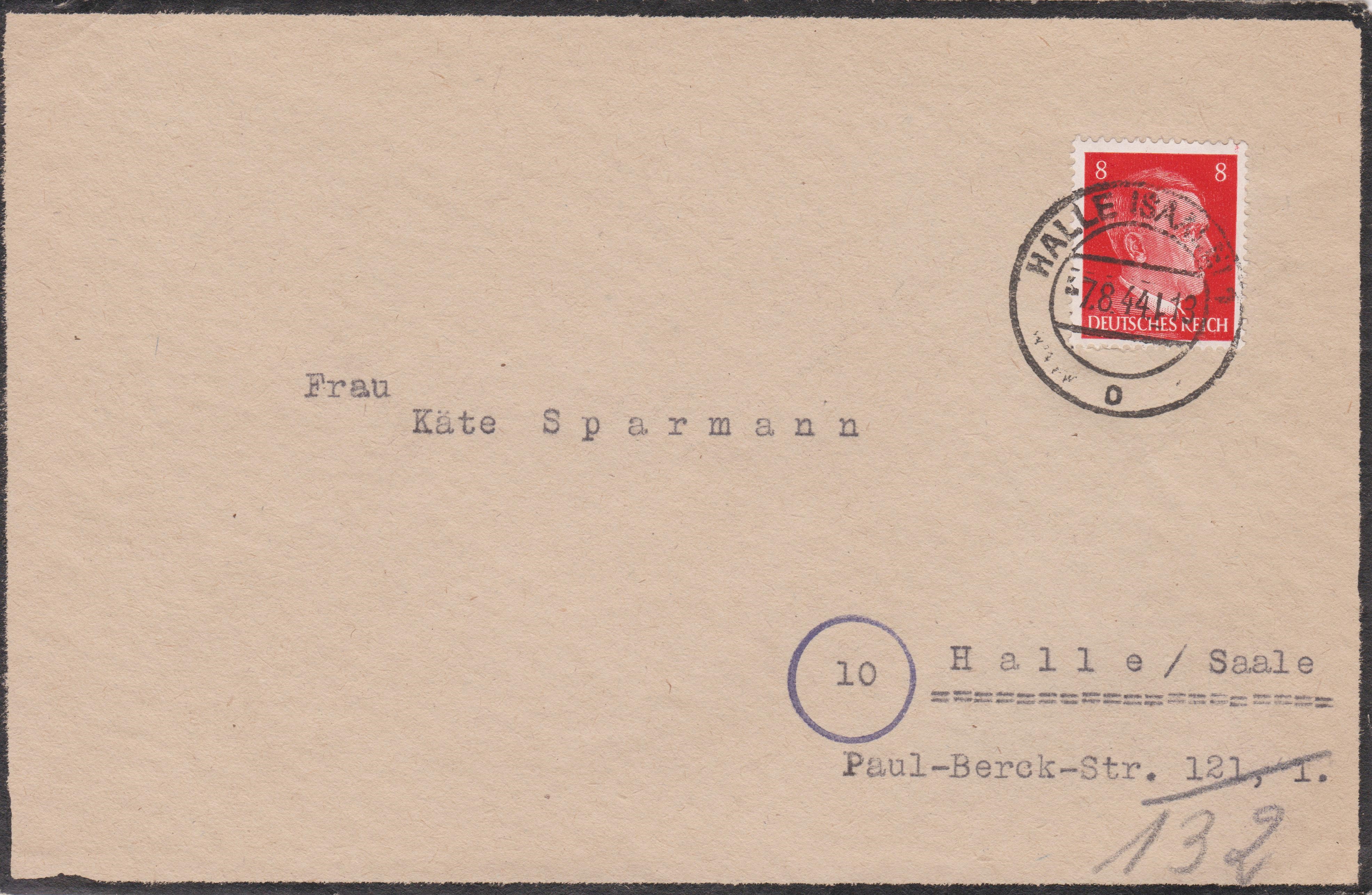 Trauerbrief, Portostufe 8 Pf, am 07.08.1944 gelaufen im Ortsverkehr von HALLE: