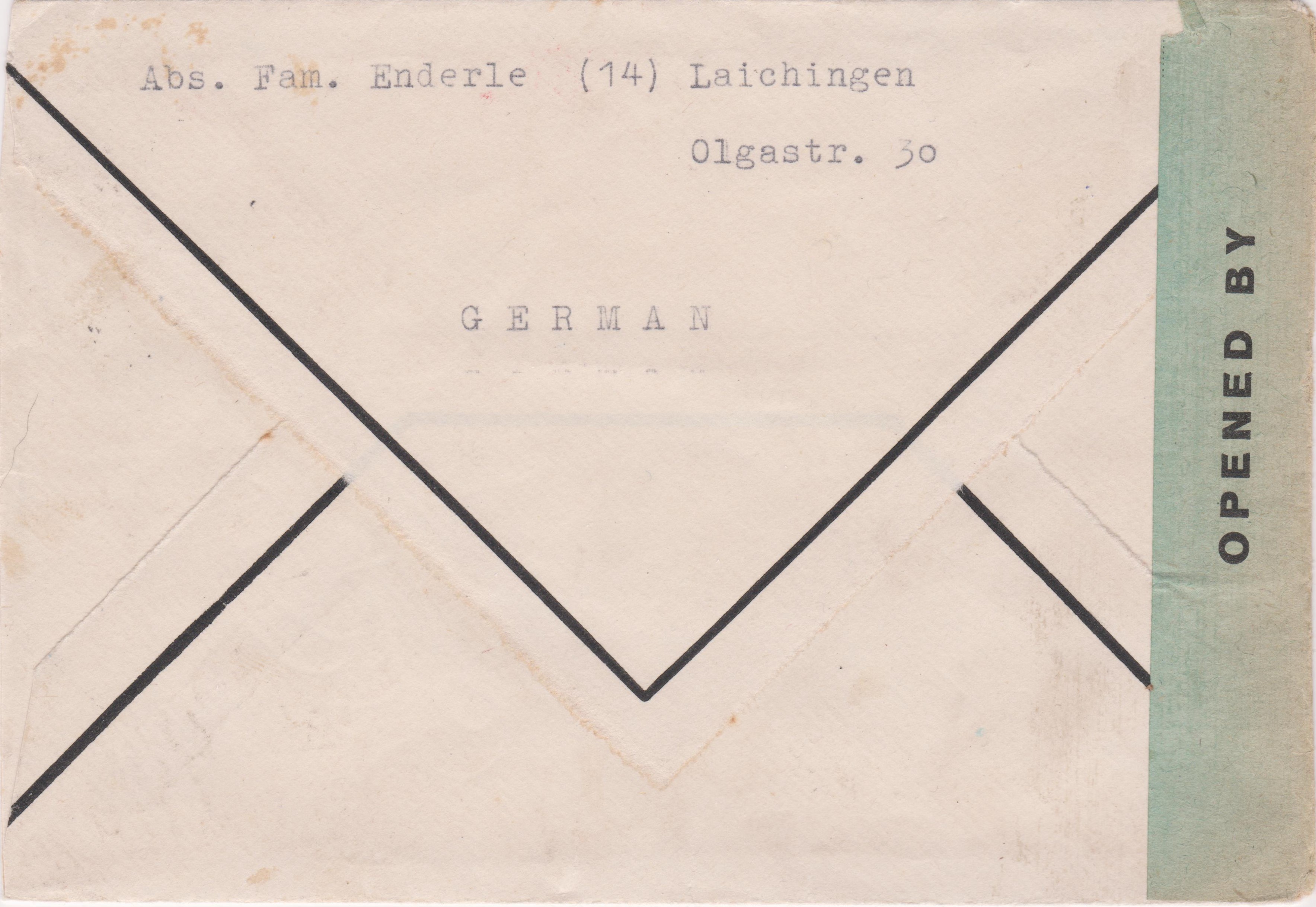 Der Brief wurde der amerikanischen Zensurstelle zugeleitet, wo er linksseitig geöffnet und nach erfolgter Prüfung mit einem Verschlußstreifen OPENED BY MIL. CEN. - CIVIL MAILS wieder verschlossen wurde, was ein Prüferstempel dokumentiert.