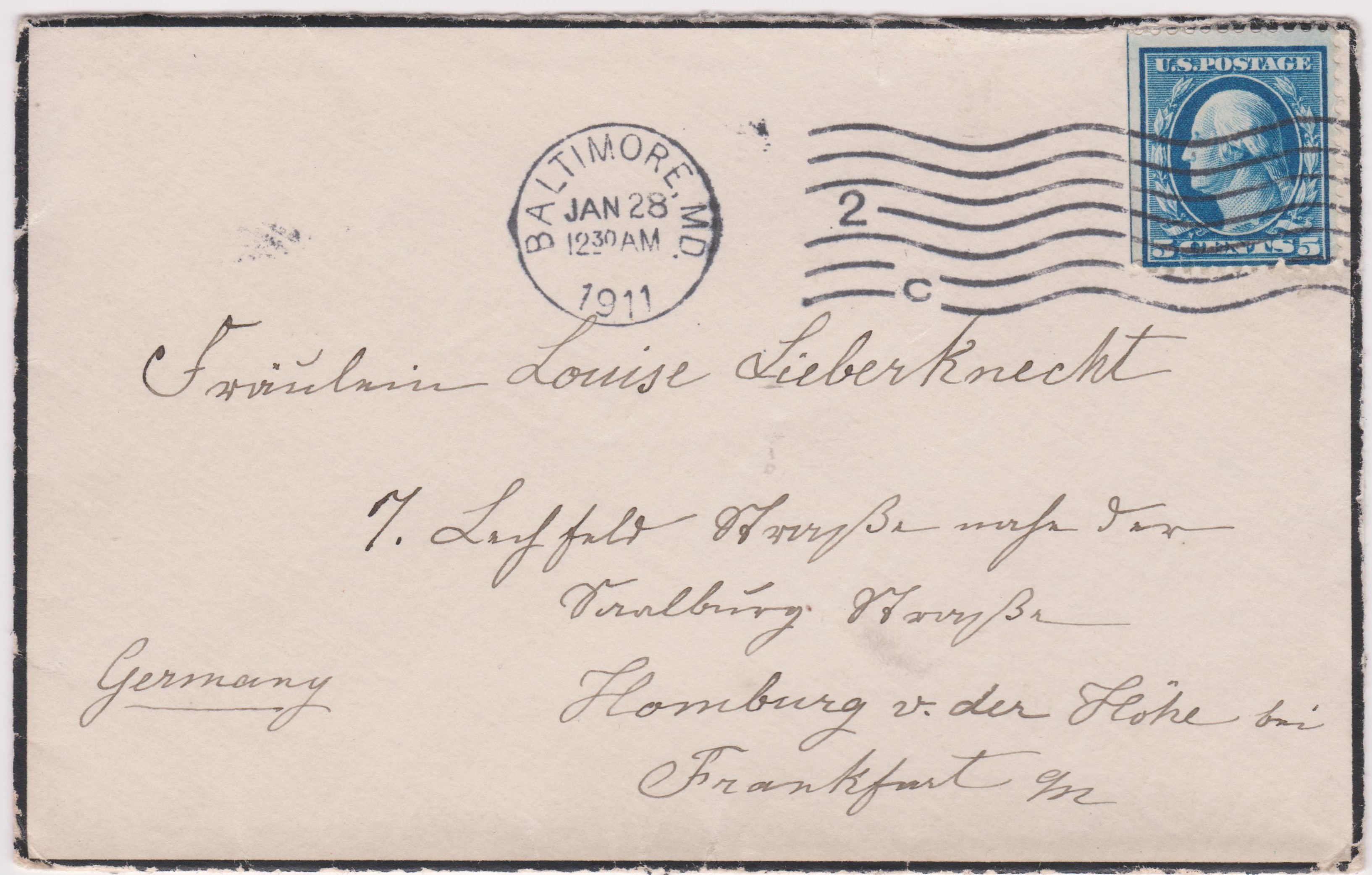 Trauerbrief aus den USA, aufgegeben am 28.01.1911 in BALTIMORE, adressiert nach "Germany":