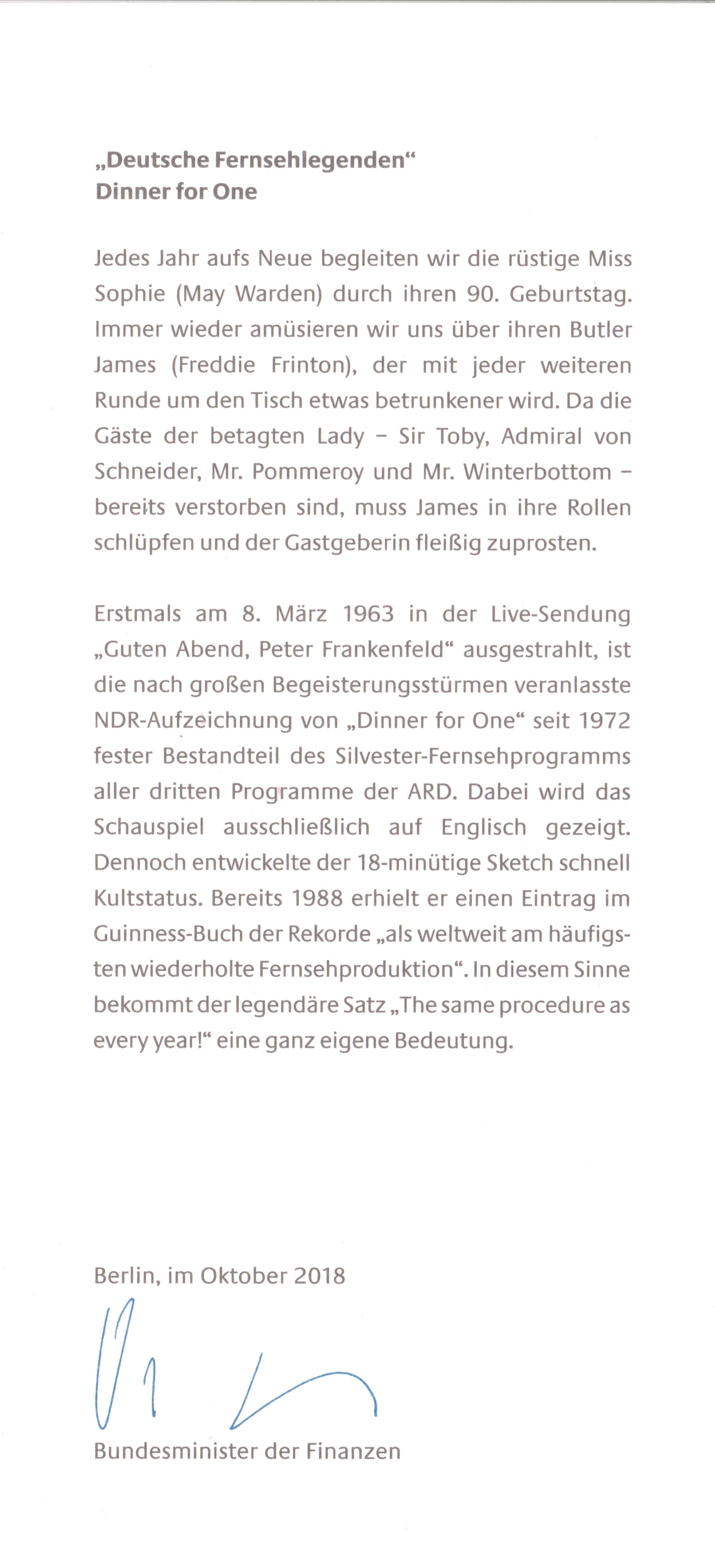 Dinner for One (originaler Langtitel laut Vorspann Der 90. Geburtstag oder Dinner for One) ist ein etwa 18-minütiger Sketch von Lauri Wylie, der in der Fassung des englischen Komikers Freddie Frinton mit seiner Partnerin May Warden bekannt geworden ist.