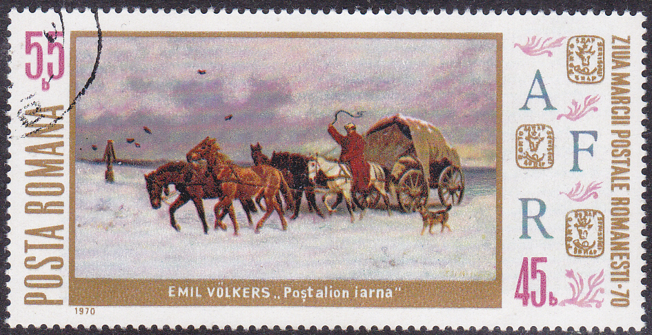 Zum Tag der Briefmarke 1970 ist in Rumänien in diese Marke (MiNr 2894) mit dem Gemälde "Postwagen im Winter" von Emil Volkers (1831-1905, deutscher Maler) und den Marken aus Rumänien MiNr. 5-7 auf der rechten Seite der Marke erschienen.