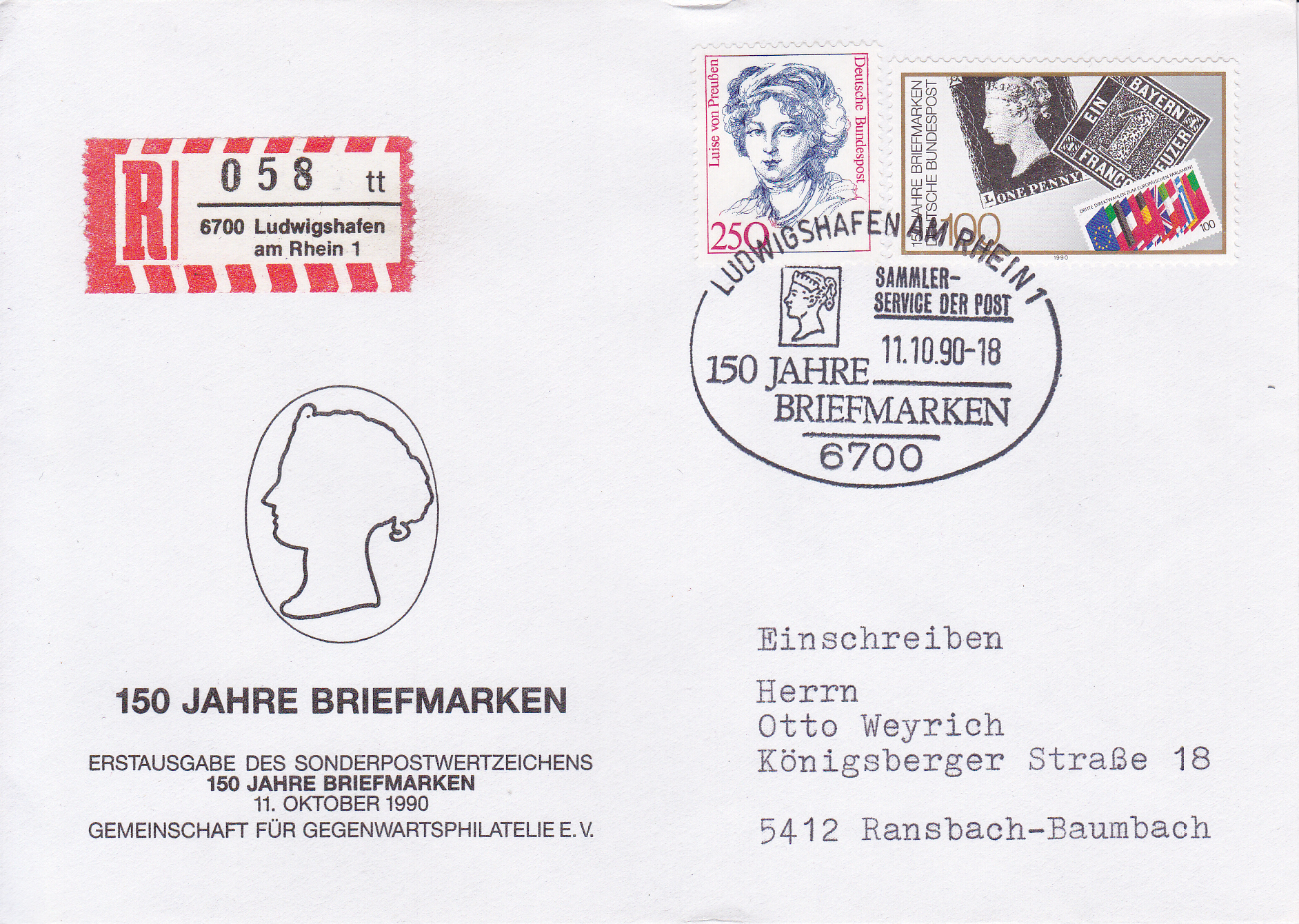 Hier zeige ich einen Brief per Einschreiben mit der Marke "150 Jahre Briefmarken" (MiNr 1479) und einer Marke zu 250 Pf aus der Serie "Bedeutende Frauen" mit dem Sonderstempel aus Ludwigshafen am Rhein.