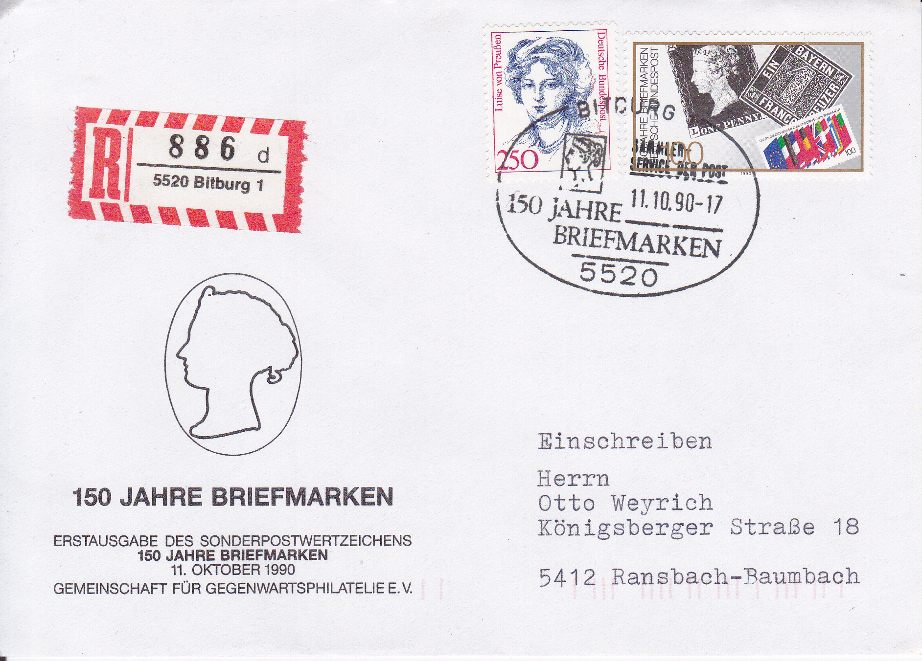 Ähnlicher Brief per Einschreiben mit der Marke "150 Jahre Briefmarken" (MiNr 1479) und einer Marke zu 250 Pf aus der Serie "Bedeutende Frauen" mit dem Sonderstempel aus Bitburg.