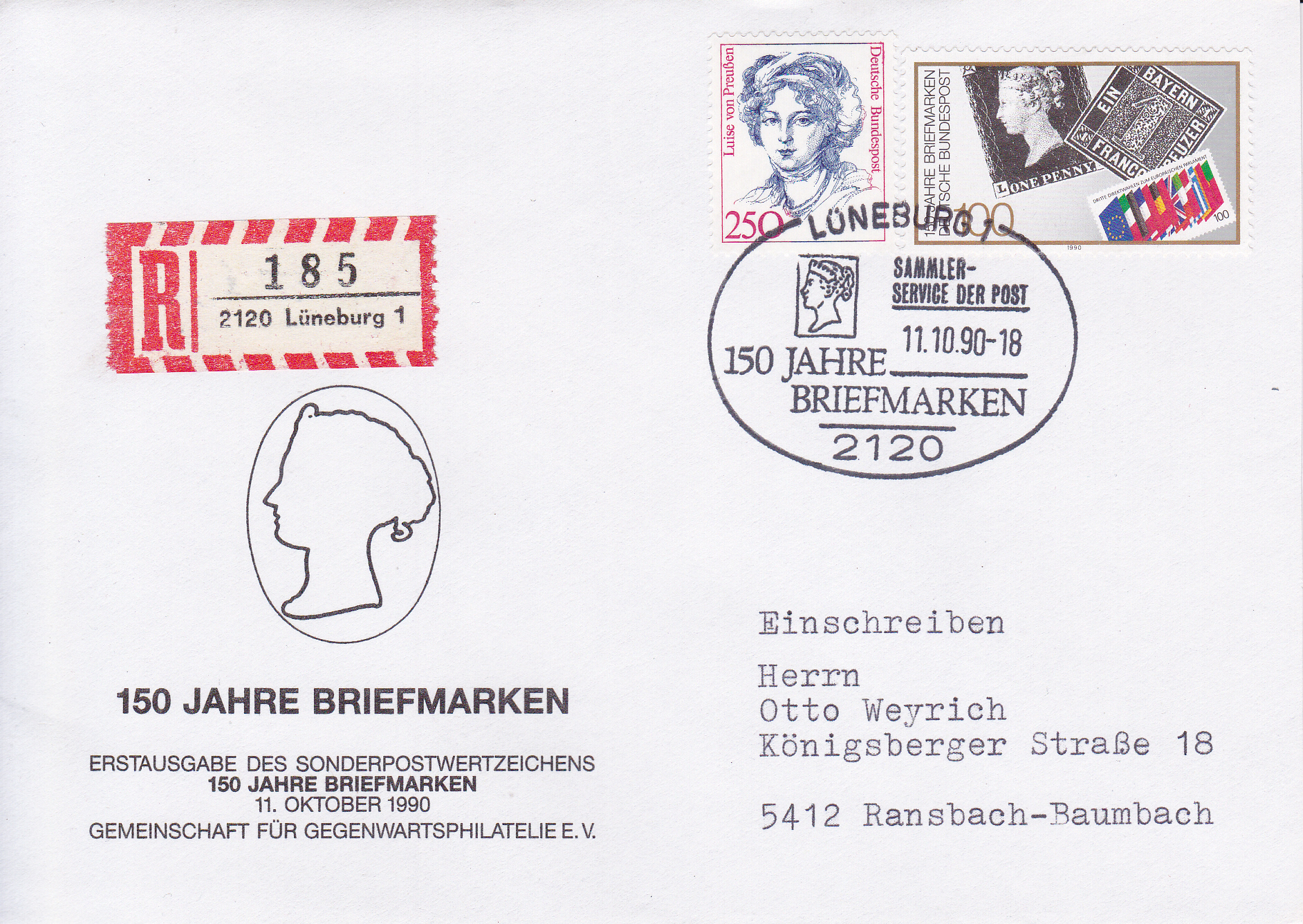 Ähnlicher Brief per Einschreiben mit der Marke "150 Jahre Briefmarken" (MiNr 1479) und einer Marke zu 250 Pf aus der Serie "Bedeutende Frauen" mit dem Sonderstempel aus Lüneburg.