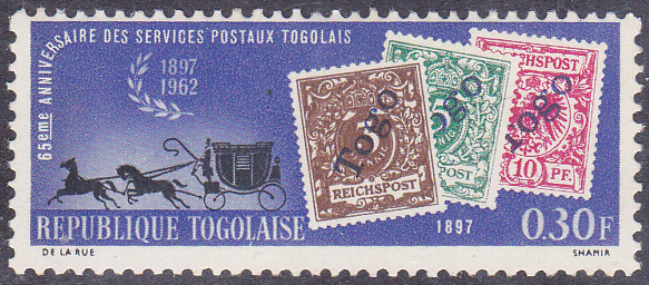 In einer Serie "65 Jahre Briefmarken von Togo" ist in Togo diese Marke (MiNr 356 A) mit den Marken Deutsche Kolonie Togo MiNr. 1 bis 3 und einer Postkutsche.
