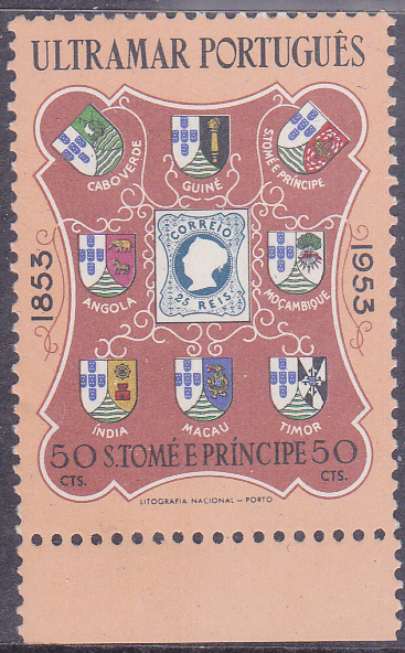 In Sao Tomé und Principe erschien diese Marke (MiNr 377) zum Thema "100 Jahre portugiesische Briefmarken". Sie zeigt die Wappen der acht Kolonien und die Freimarke zu 25 Reis von Portugal aus dem Jahre 1853 (MiuNr 2).