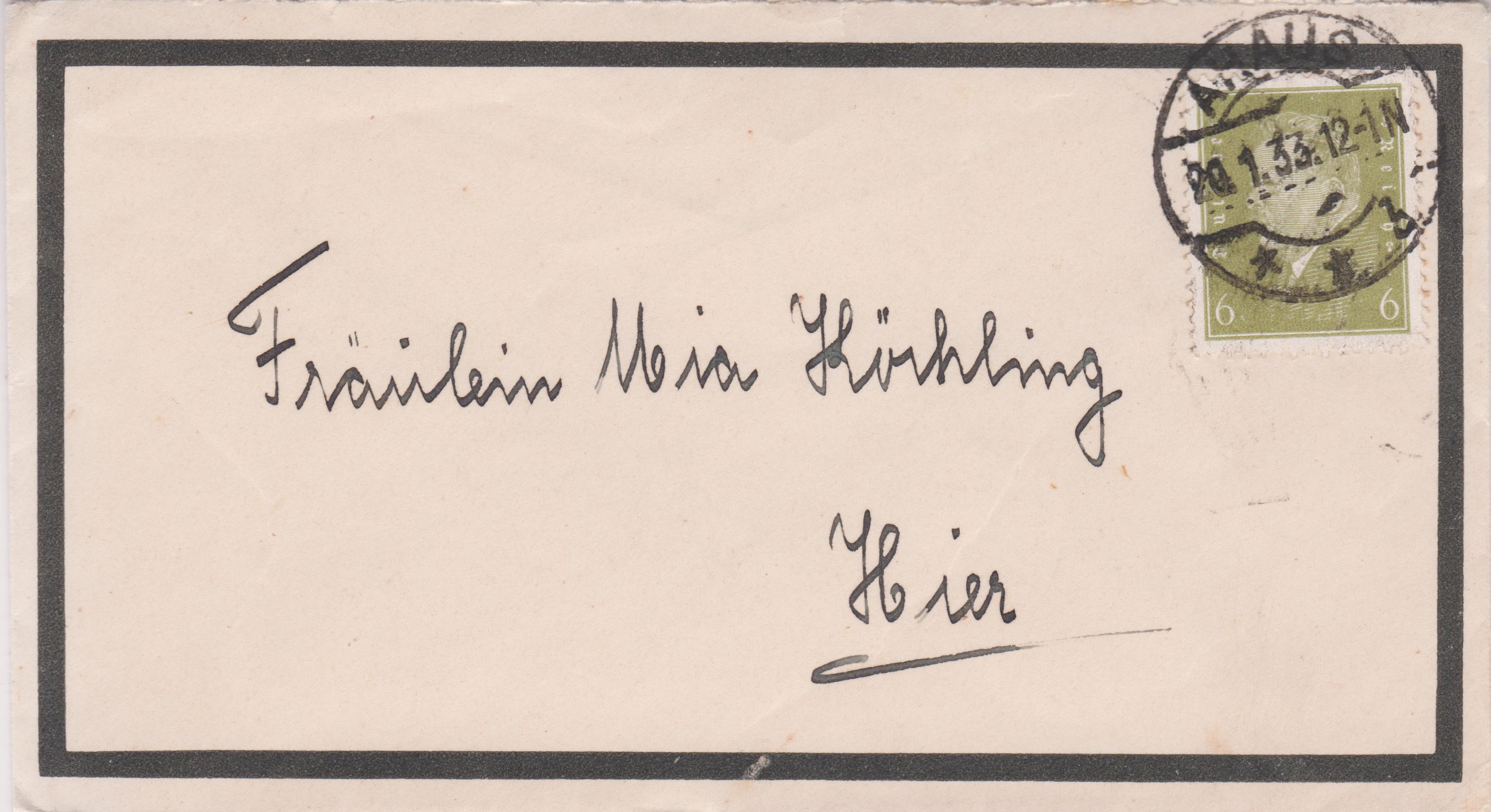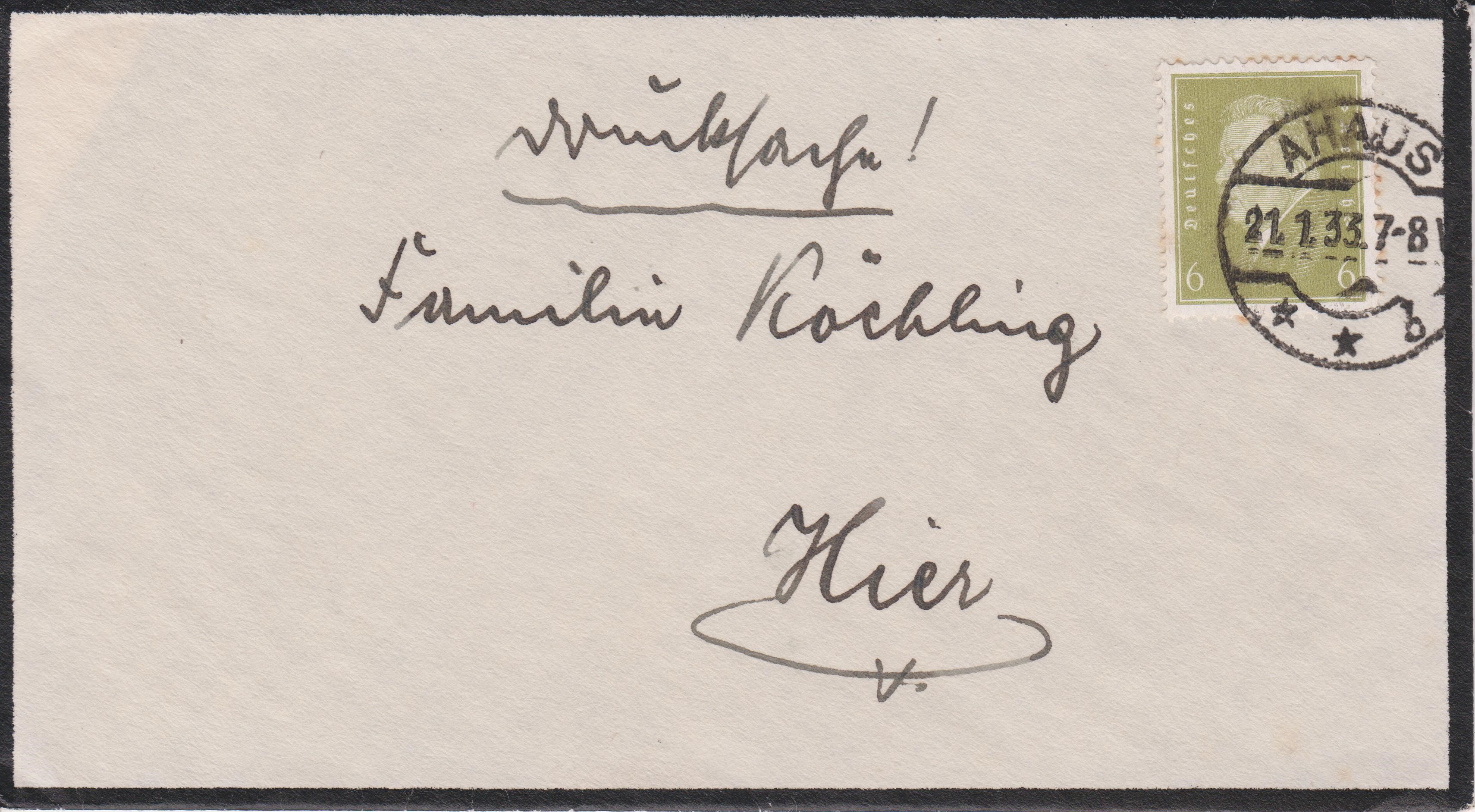 Trauerdrucksache, Portostufe 3 Pf, gelaufen im Ortsverkehr von AHAUS, freigemacht per Einzelfrankatur mit 3 Pf Dauerserie Hindenburg, entwertet am 13.02.1936 per Tagesstempel AHAUS b: