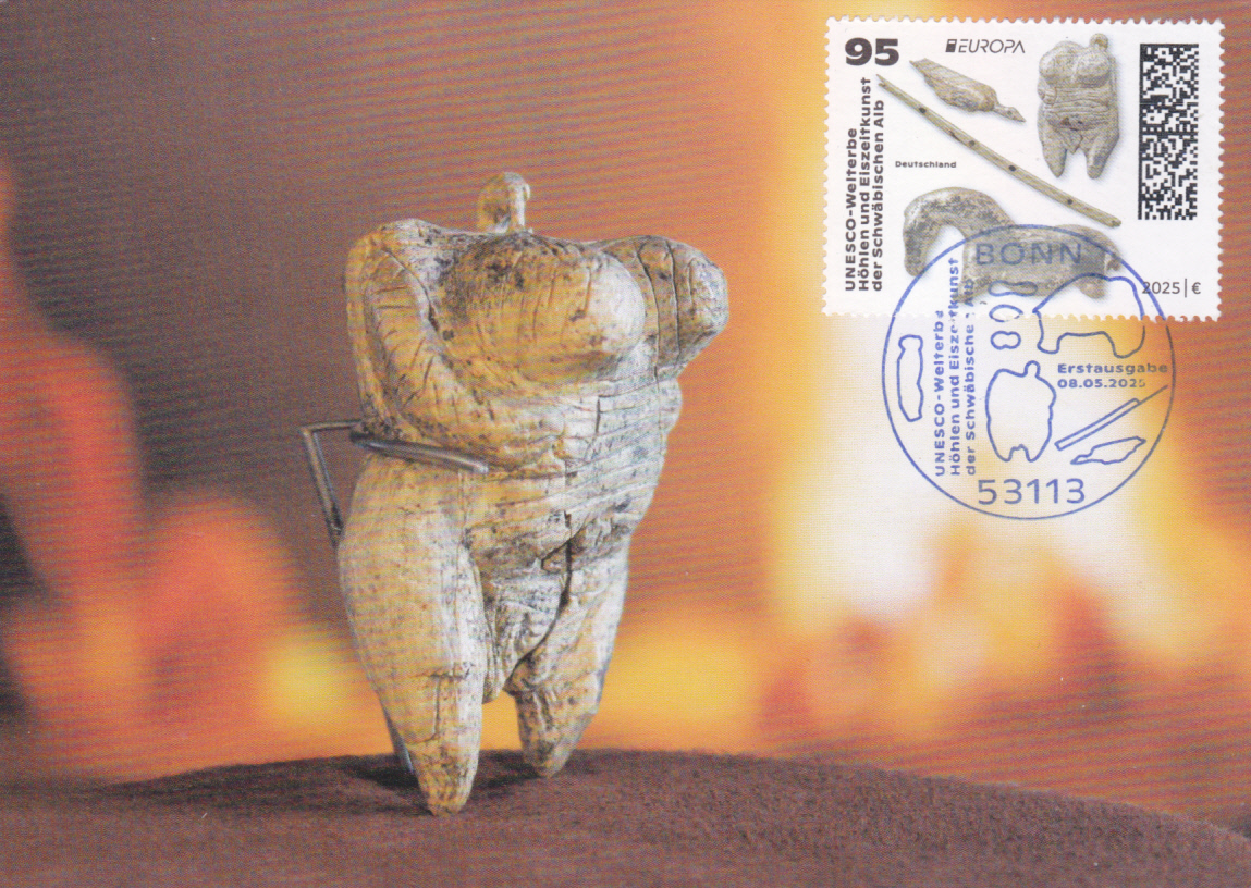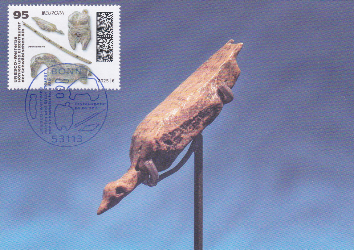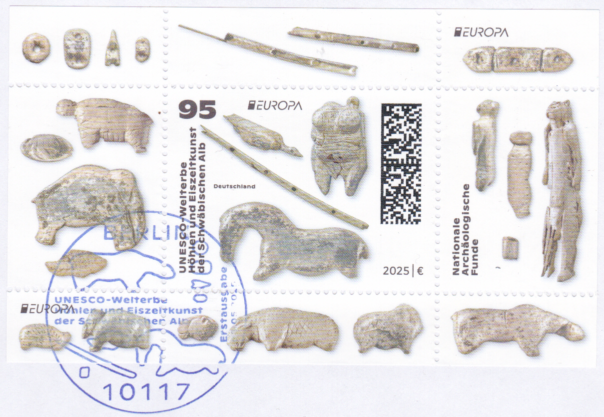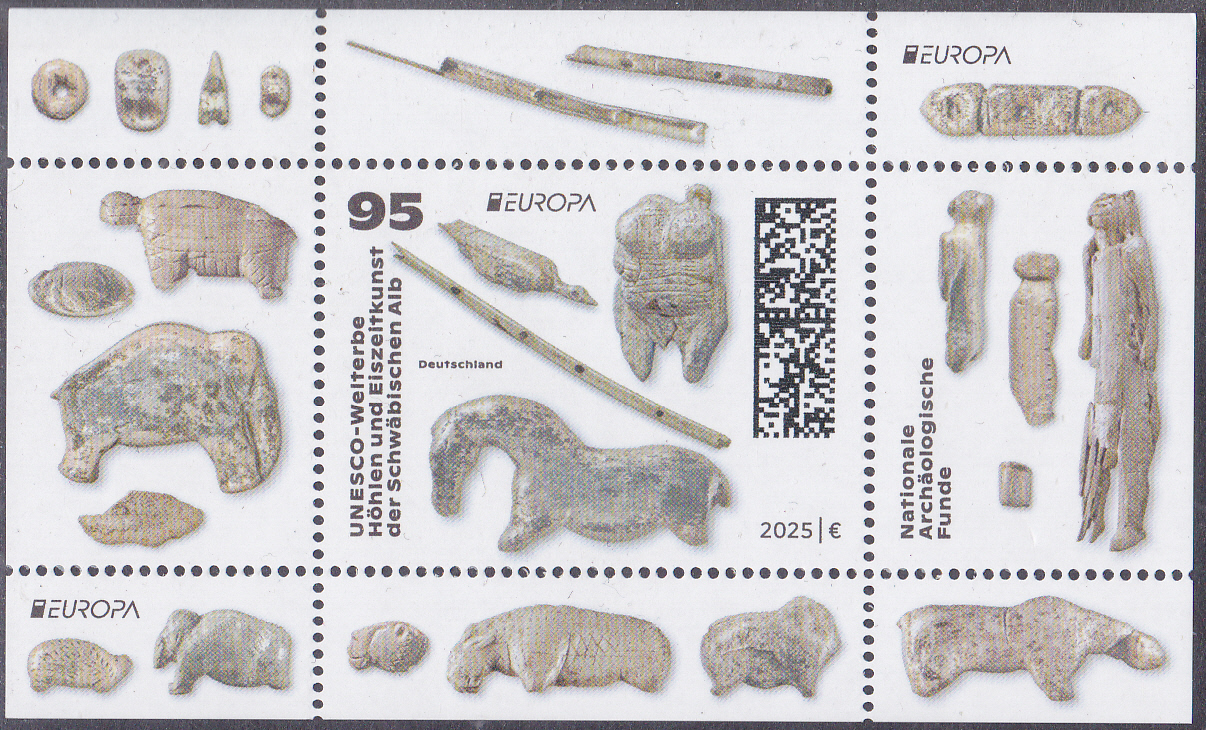 Die Europamarke 2025 ist in einer Blockausgabe (MiNr Block 94) bei der Deutschen Post am 8. Mai 2025 zum Thema "Nationale archäologische Funde" erschienen. Die Marke zu 95 Cent (MiNr 3907) zeigt "Wasservogel, Venusfigurine, Flöte, Wildpferd" nach Mammutelfenbein- und Knochenfiguren aus den Höhlen Vogelherd, Hohler Fels, Geißenklösterle und Hohlensteinstadel (UNESCO-Welterbe "Höhlen und Eiszeitkunst der Schwäbischen Alb").