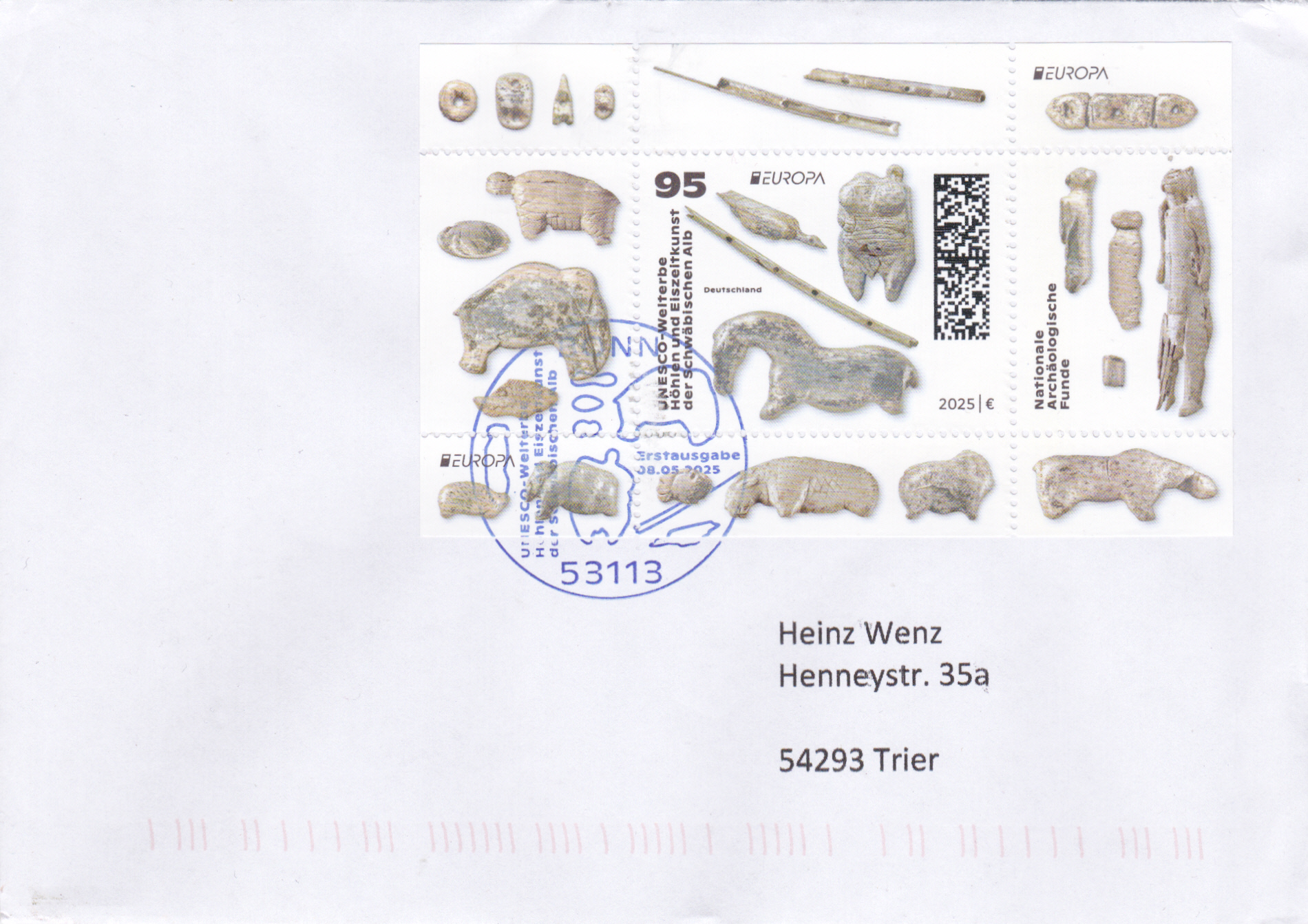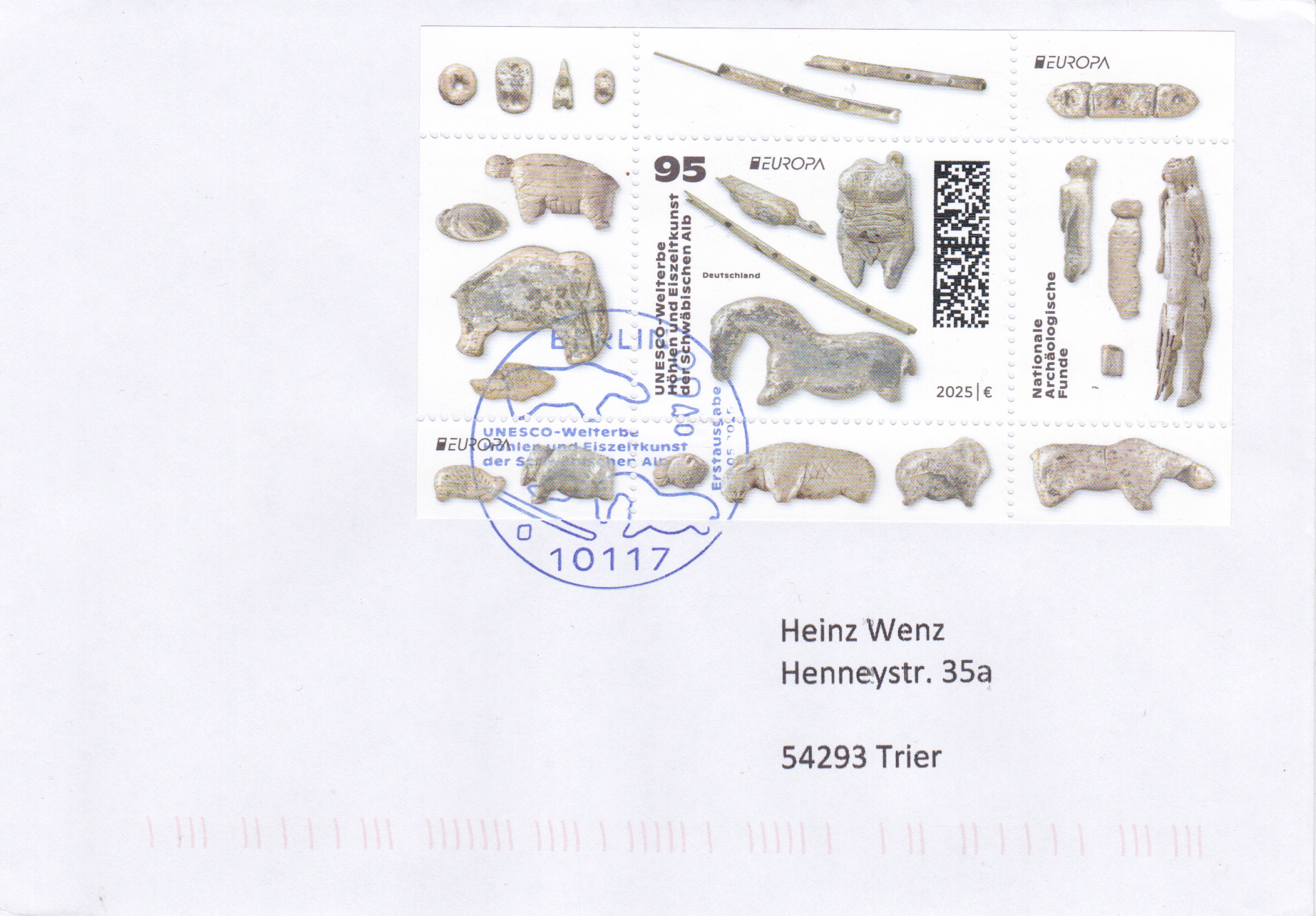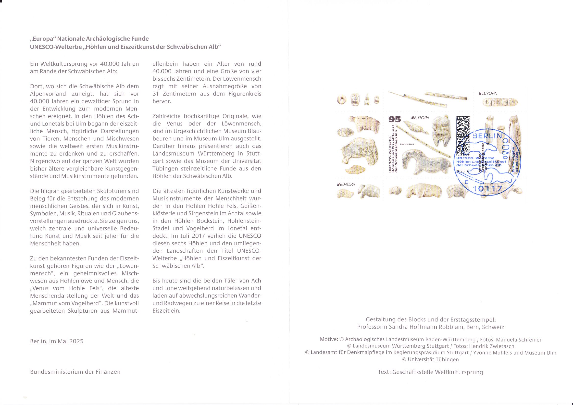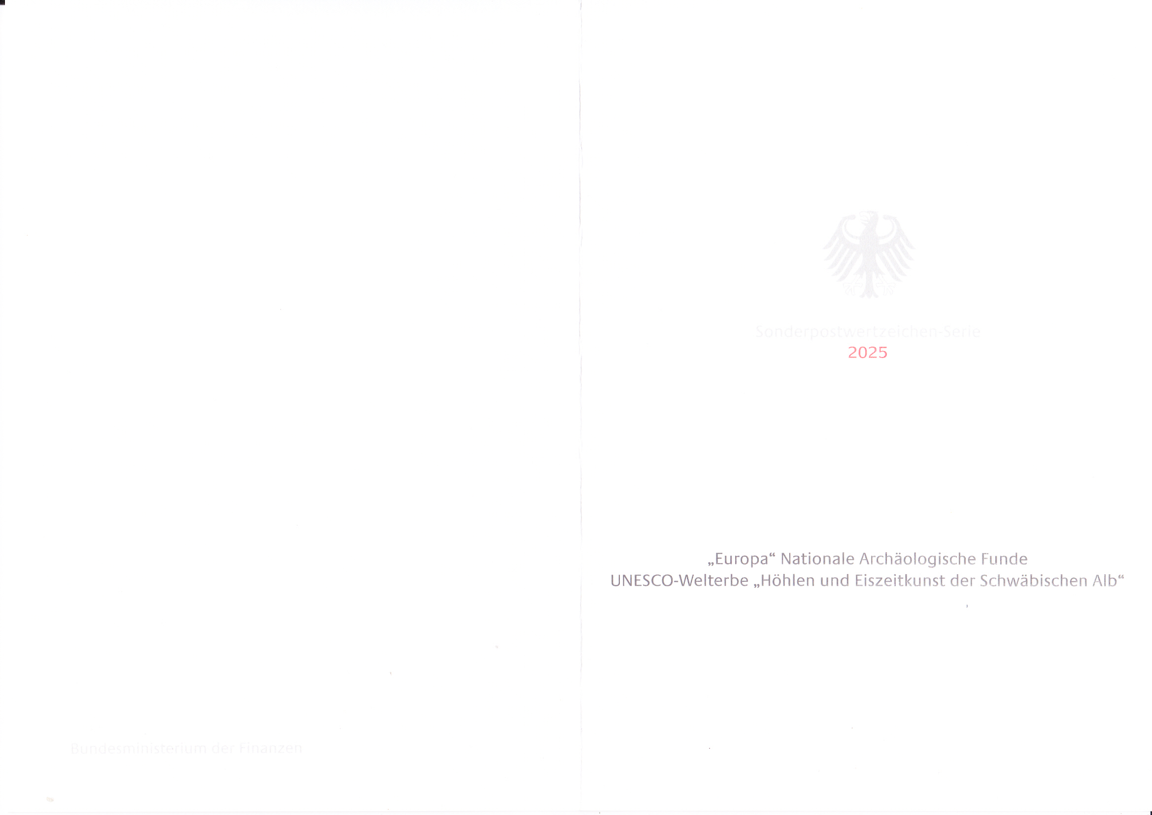 Die Europamarke 2025 ist in einer Blockausgabe (MiNr Block 94) bei der Deutschen Post am 8. Mai 2025 zum Thema "Nationale archäologische Funde" erschienen. Die Marke zu 95 Cent (MiNr 3907) zeigt "Wasservogel, Venusfigurine, Flöte, Wildpferd" nach Mammutelfenbein- und Knochenfiguren aus den Höhlen Vogelherd, Hohler Fels, Geißenklösterle und Hohlensteinstadel (UNESCO-Welterbe "Höhlen und Eiszeitkunst der Schwäbischen Alb").