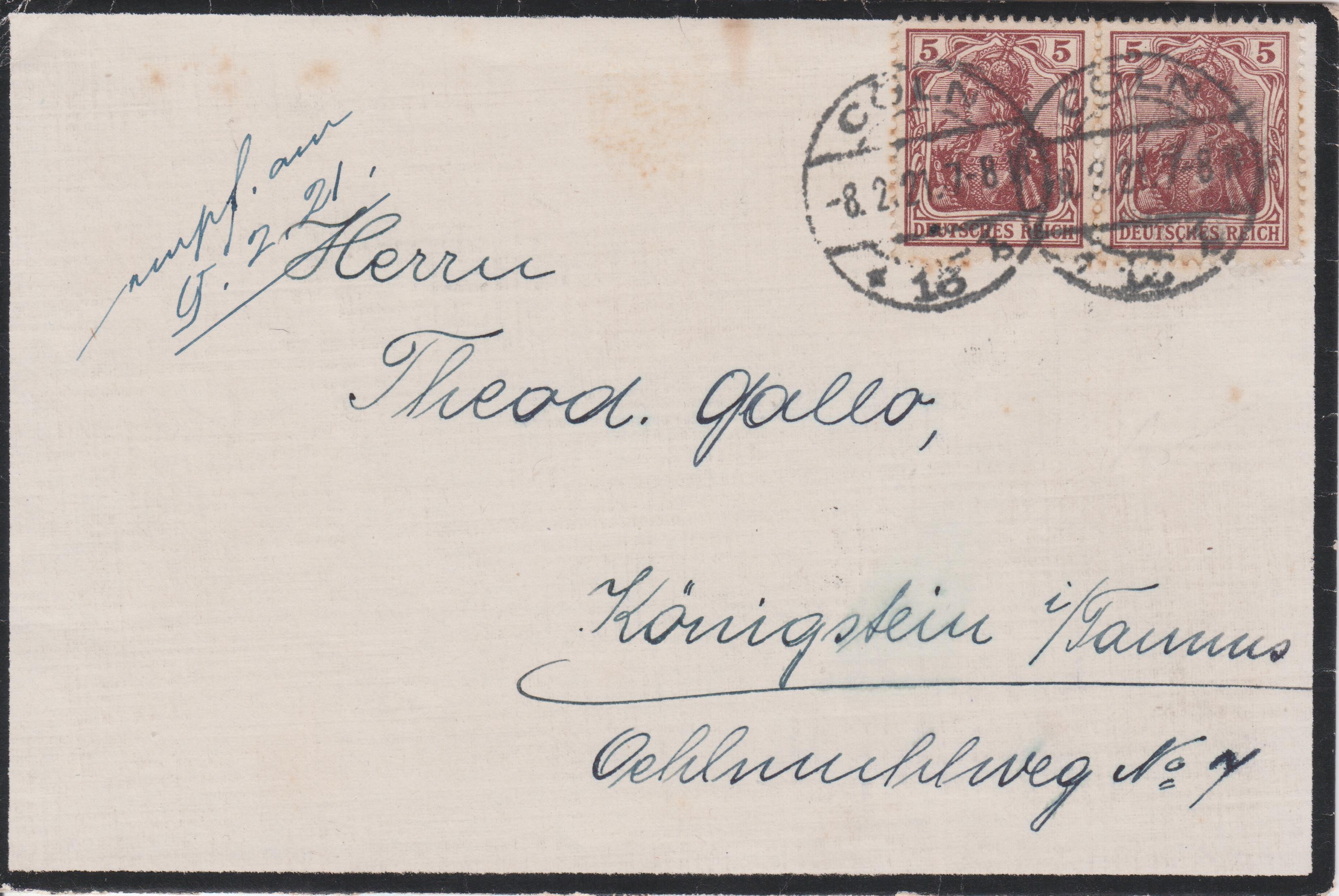 Mehrfachfrankatur von zwei Germania 5 Pf, Deutsches Reich MiNr. 140 a, am 08.02.1921 auf Trauerbrief von CÖLN nach Königstein im Taunus: