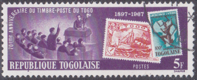 Zum Jubiläum "70 Jahre Briefmarken von Togo" wurde in einer Serie in Togo diese Marke (MiNr 614 A) mit den Marken Deutsch-Togo MiNr 16 und Togo MiNr 429 und einer Briefmarkenauktion verausgabt.