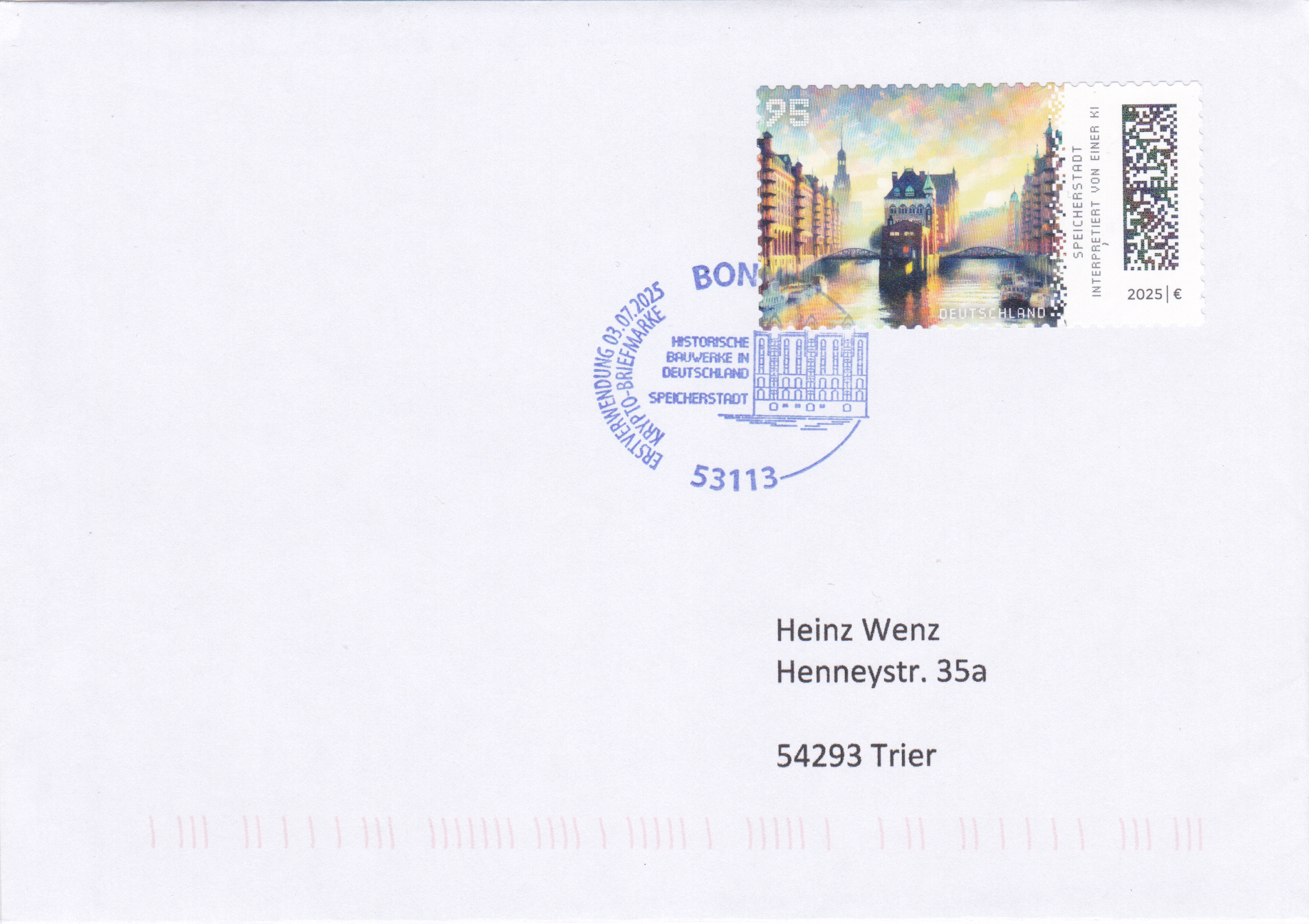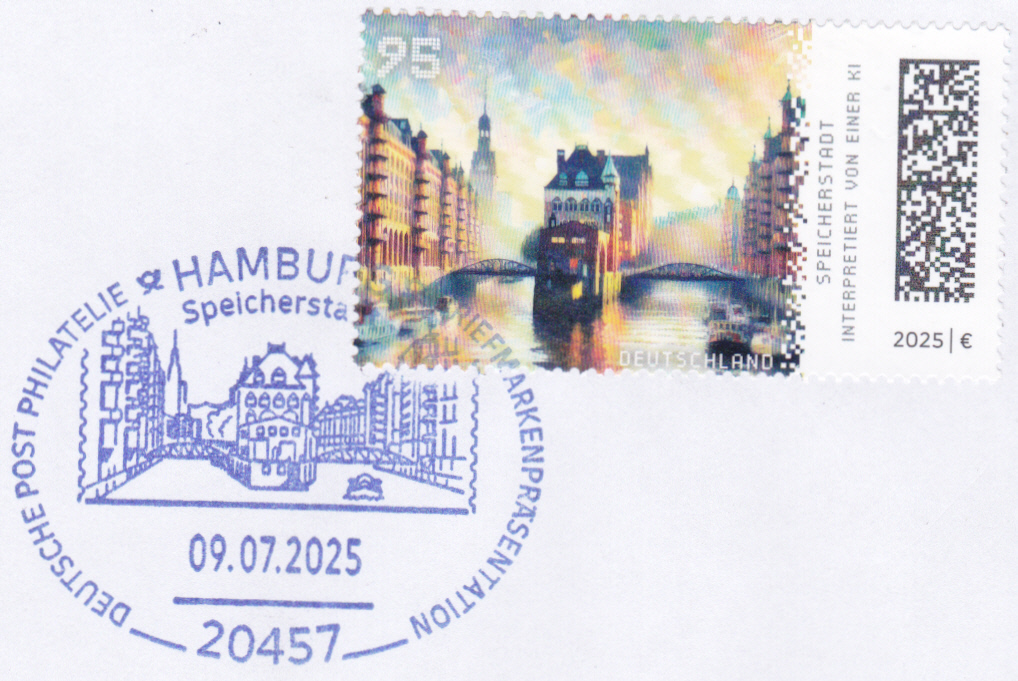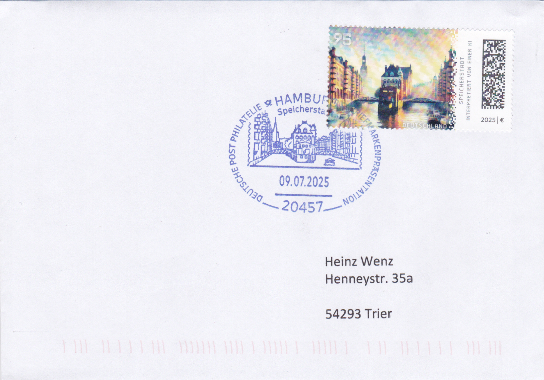 Brief vom Ersttag mit dieser Marke und dem Sonderstempel aus Hamburg vom 9.7.2025 zur Präsentation der Marke.