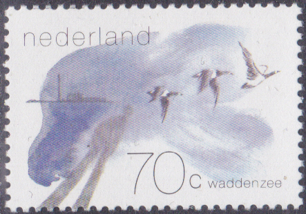Aus den Niederlande kommt diese Marke (MiNr 1209) zum Thema "Wattenmeer" mit einer Brandseeschwalbe (Sterna sandvicensis) und einer Eiderente (Somateria mollissima).