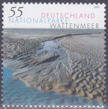 Auch bei der Deutschen Post gibt es Marken zum Thema "Wattenmeer". In der Serie Deutsche National- und Naturparks gibt es diese Marke "Nationalparks im Wattenmeer" (MiNr 2407) mit der Abbildung "Priel im Watt".
