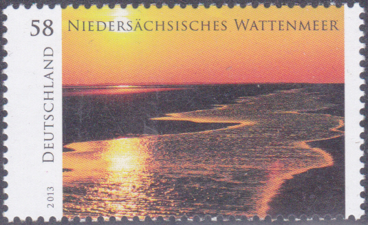 Auf einer Marke aus der Serie "Wildes Deutschland" der Deutschen Post (MiNr 3017) sehen wir eine Abbildung aus dem Niedersächsisches Wattenmeer "Priele auf Spiekeroog".