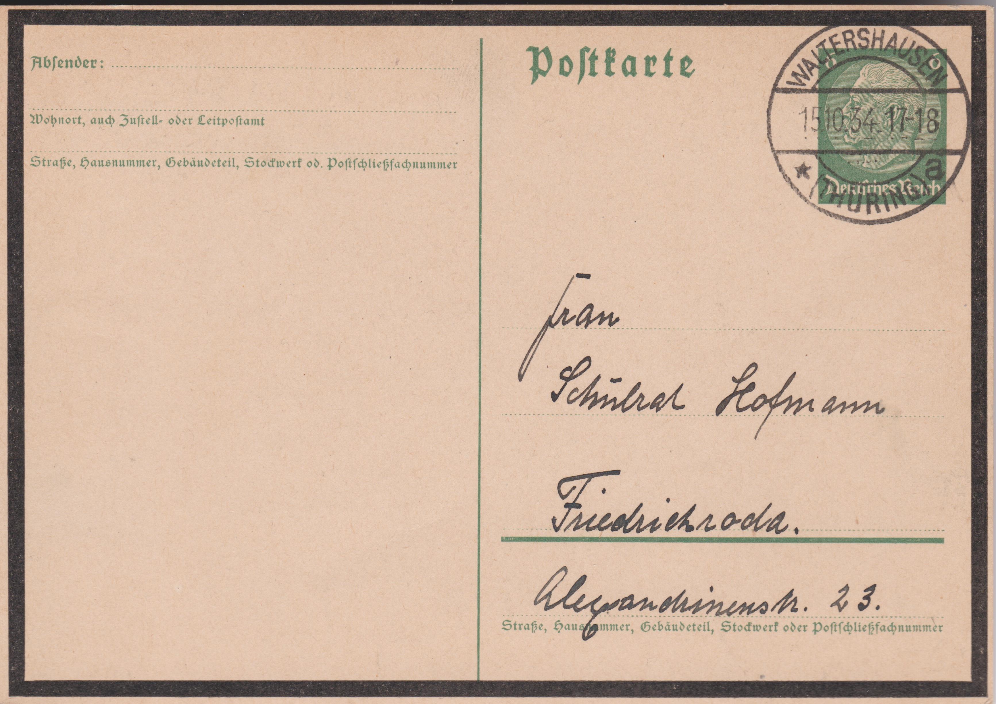 Ganzsache 6 Pf Hindenburg Medaillon mit Trauerrand, gelaufen im Oktober 1934 im Fernverkehr von WALTERSHHAUSEN nach Friedrichsroda: