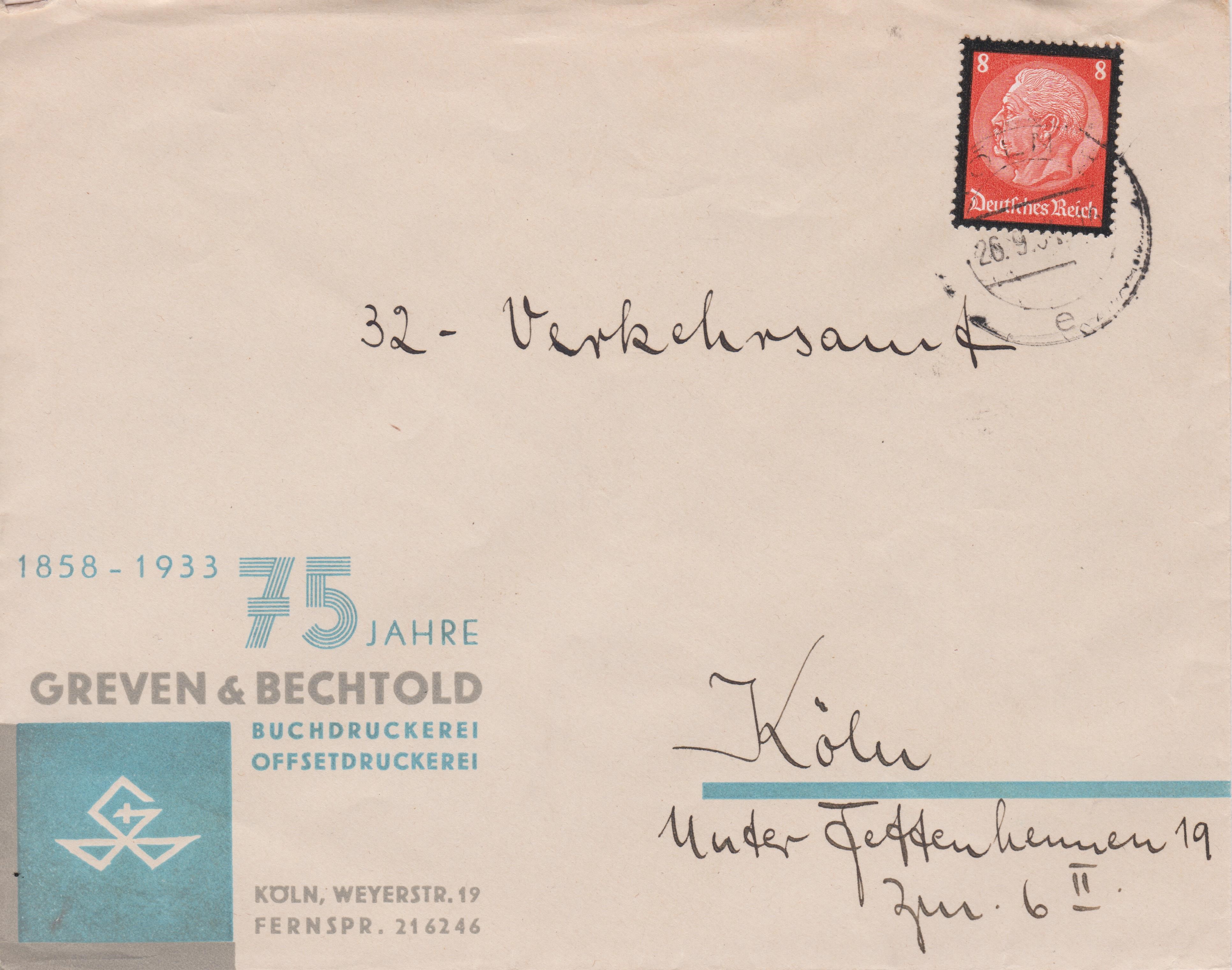 8 Pf Dauerserie Hindenburg mit Trauerrand, am 26.09.1934 portogerecht auf Brief, gelaufen im Ortsverkehr von Köln: