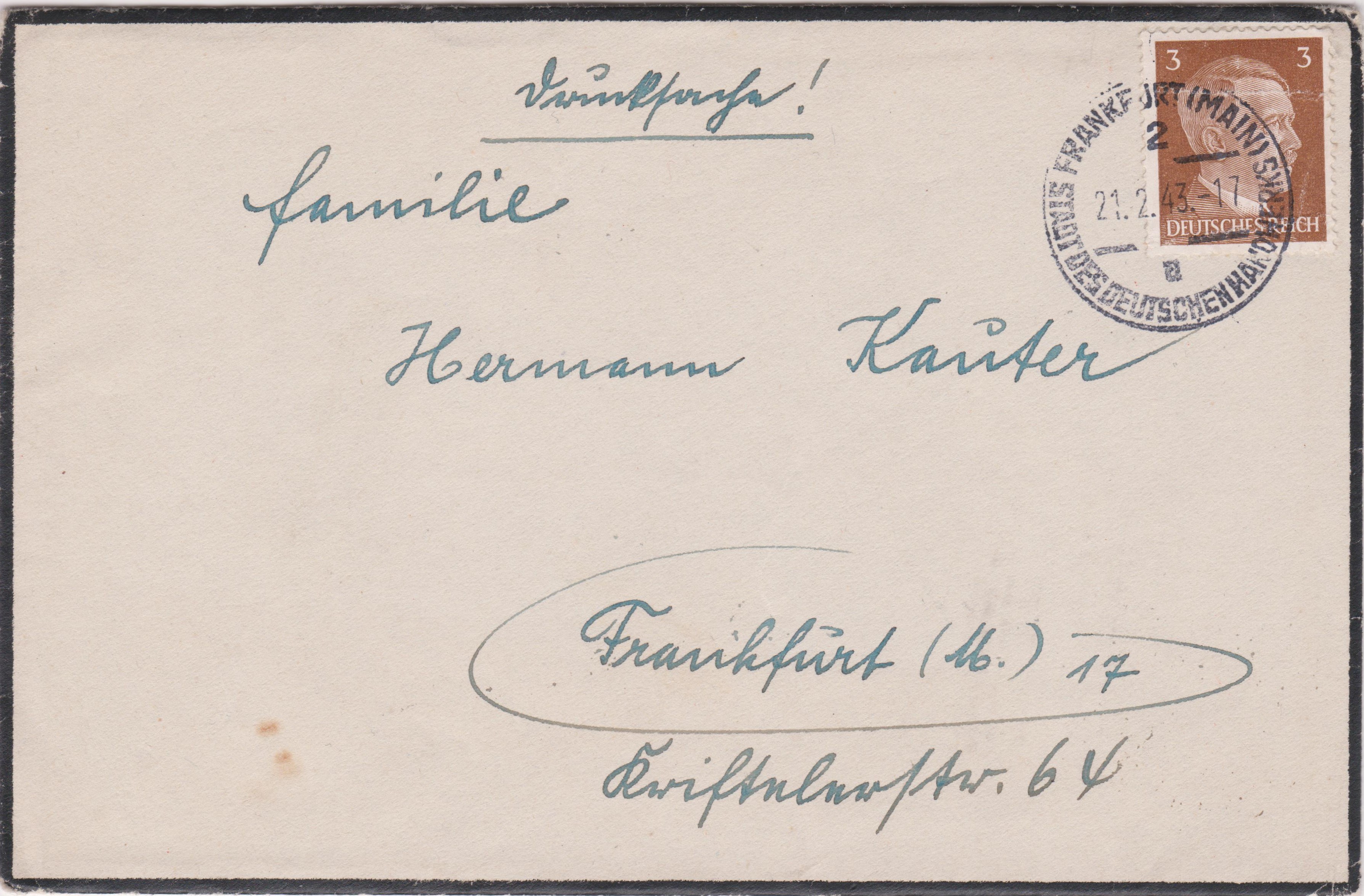 Trauerdrucksache, Portostufe 3 Pf, am 21.02.1943 freigemacht per Einzelfrankatur Dauerserie Adolf Hitler, entwertet per Handstempel FRANKFURT (MAIN) 2 a STADT DER AUSLANDSDEUTSCHEN: