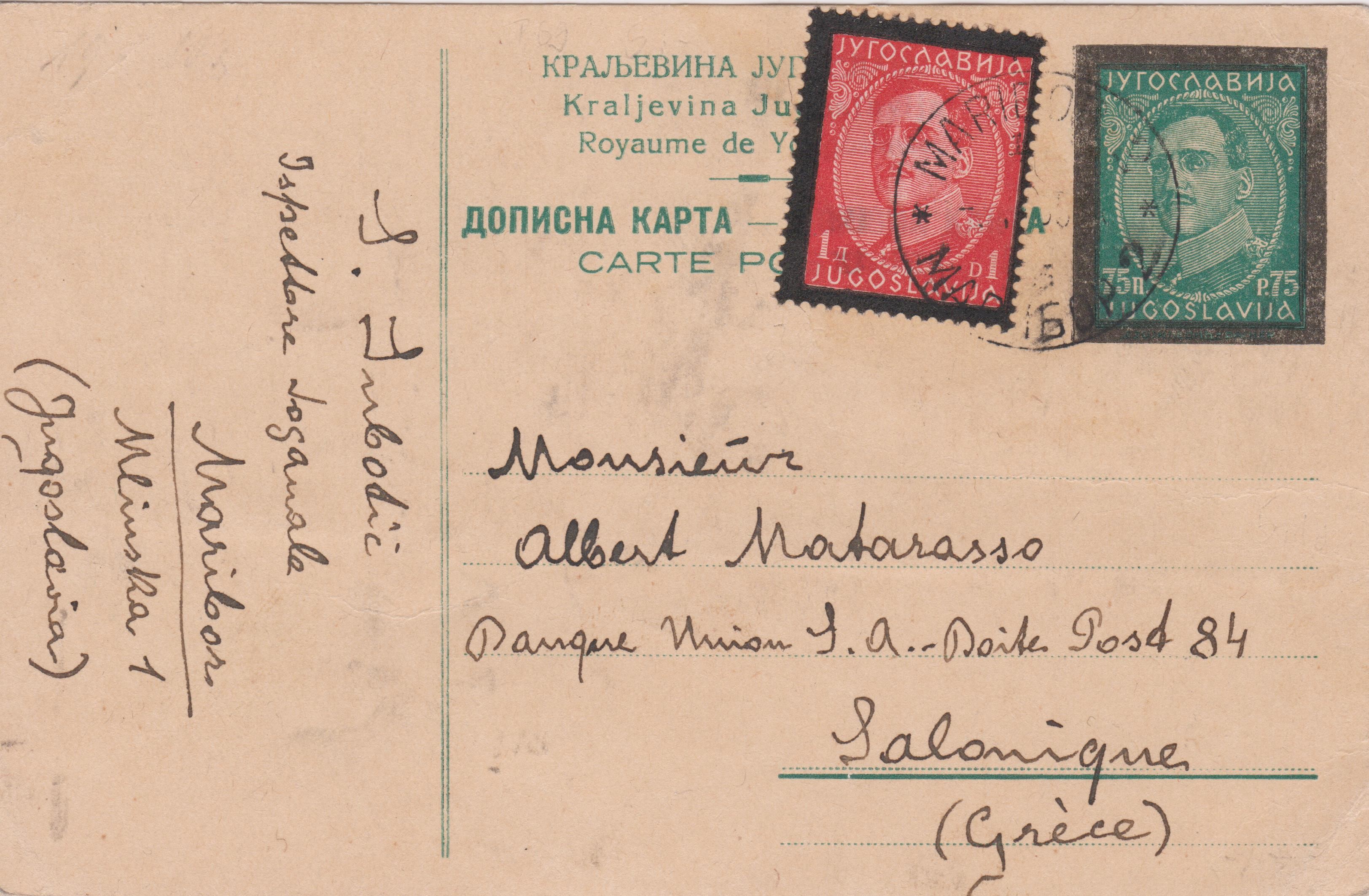 Postkarte mit Zusatzfrankatur aus Jugoslawien, mit Trauerrand erschienen zum Tod von König Alexander, gebraucht am 03.07.1935 nach Saloniki in Griechenland:
