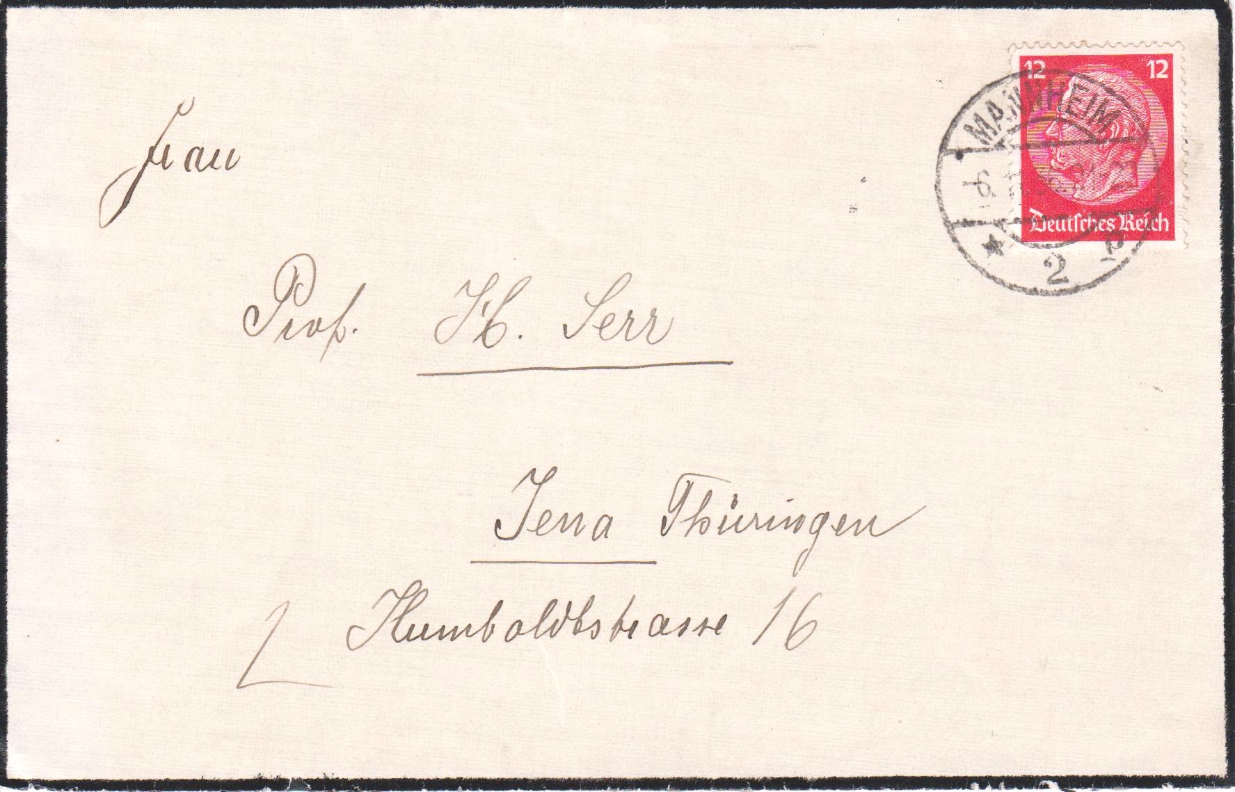 EF 12 Pf Dauerserie Hindenburg am 06.11.1936 auf Trauerbrief von MANNHEIM nach Jena: