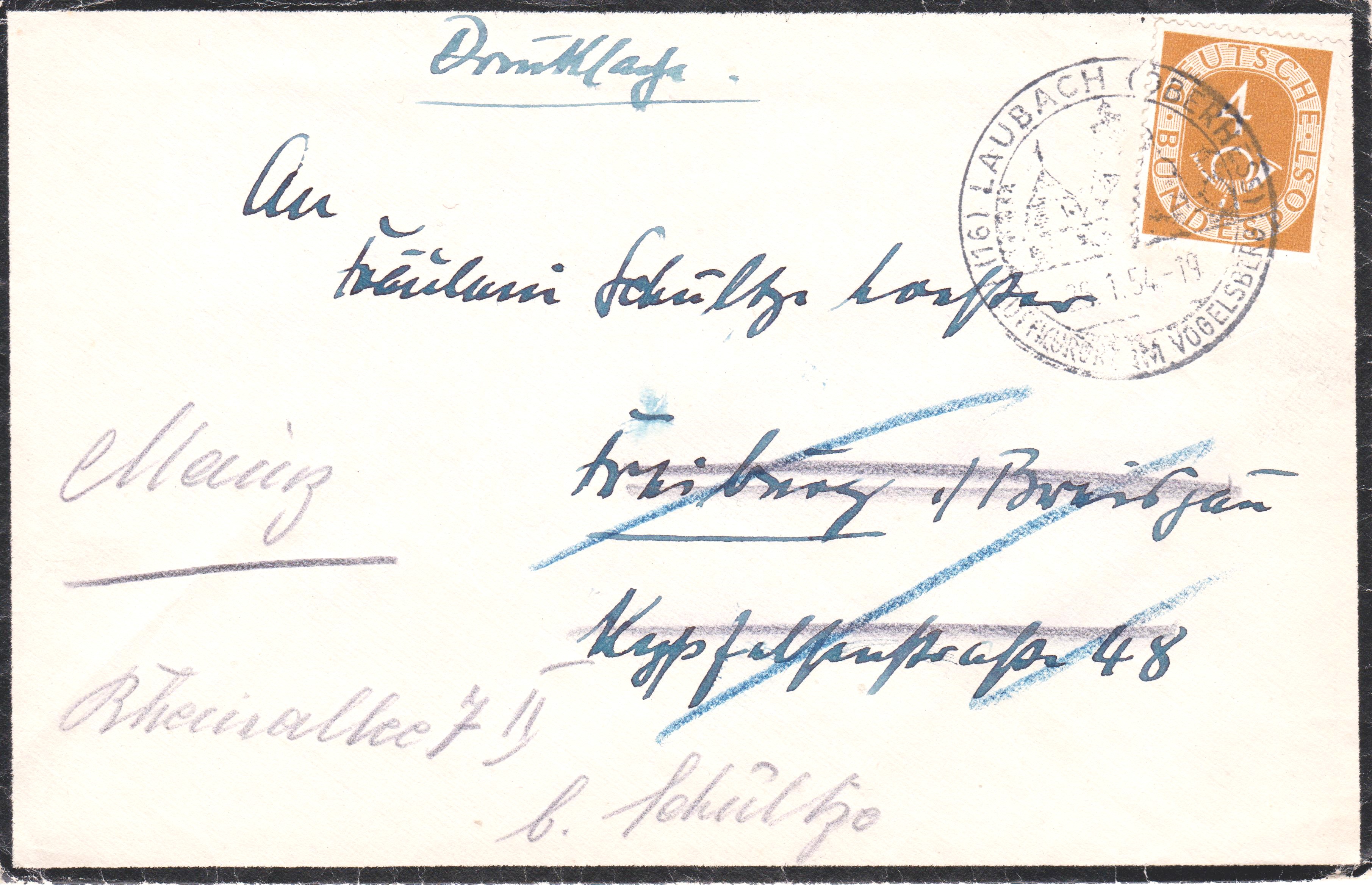 Diese nach Freiburg im Breisgau adressoerte Trauerdrucksache mit Einzelfrankatur 4 Pf Posthorn wurde am 26.01.1954 in "(16) LAUBACH" wurde mit einem Handwerbestempel versehen und von Freiburg dann nach "Mainz" weitergeleitet: