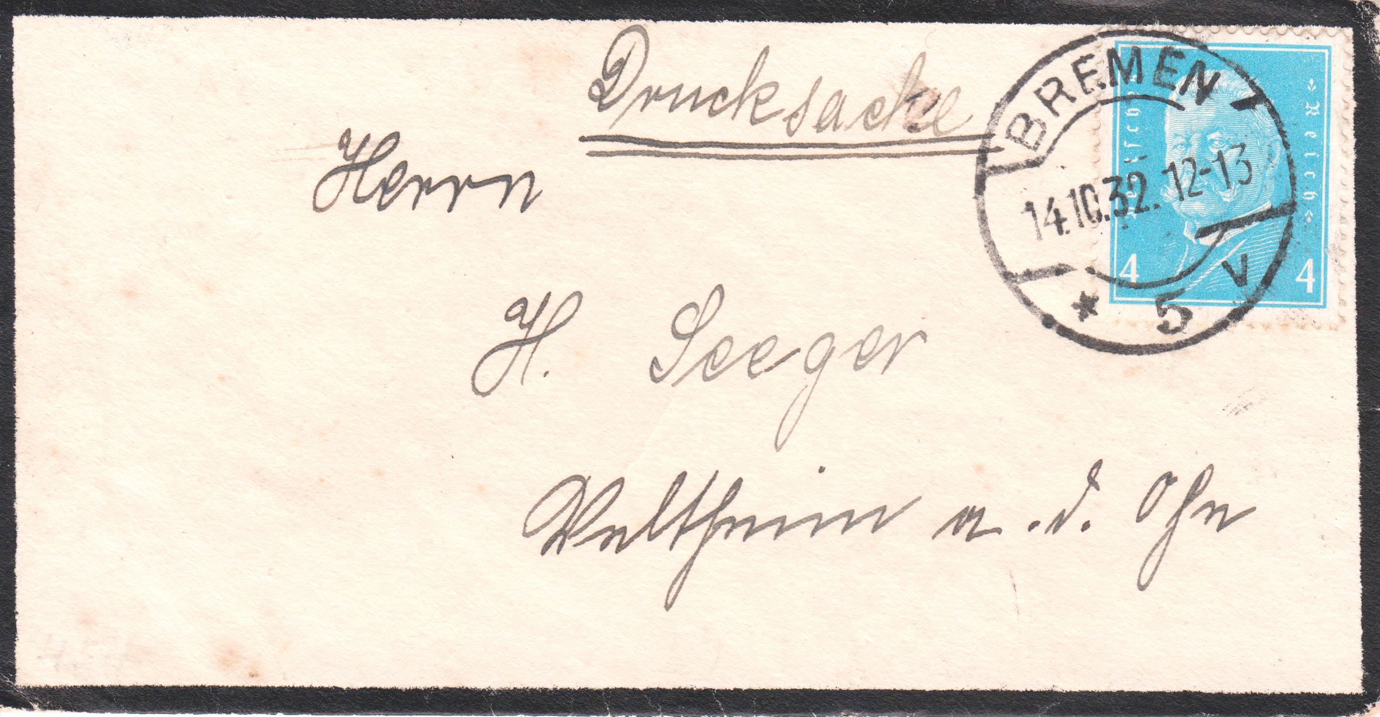 Trauerdrucksache in Briefform, an 14.10.1932 in BREMEN freigemacht per Einzelfrankatur 4 Pf Dauerserie Reichspräsidenten: