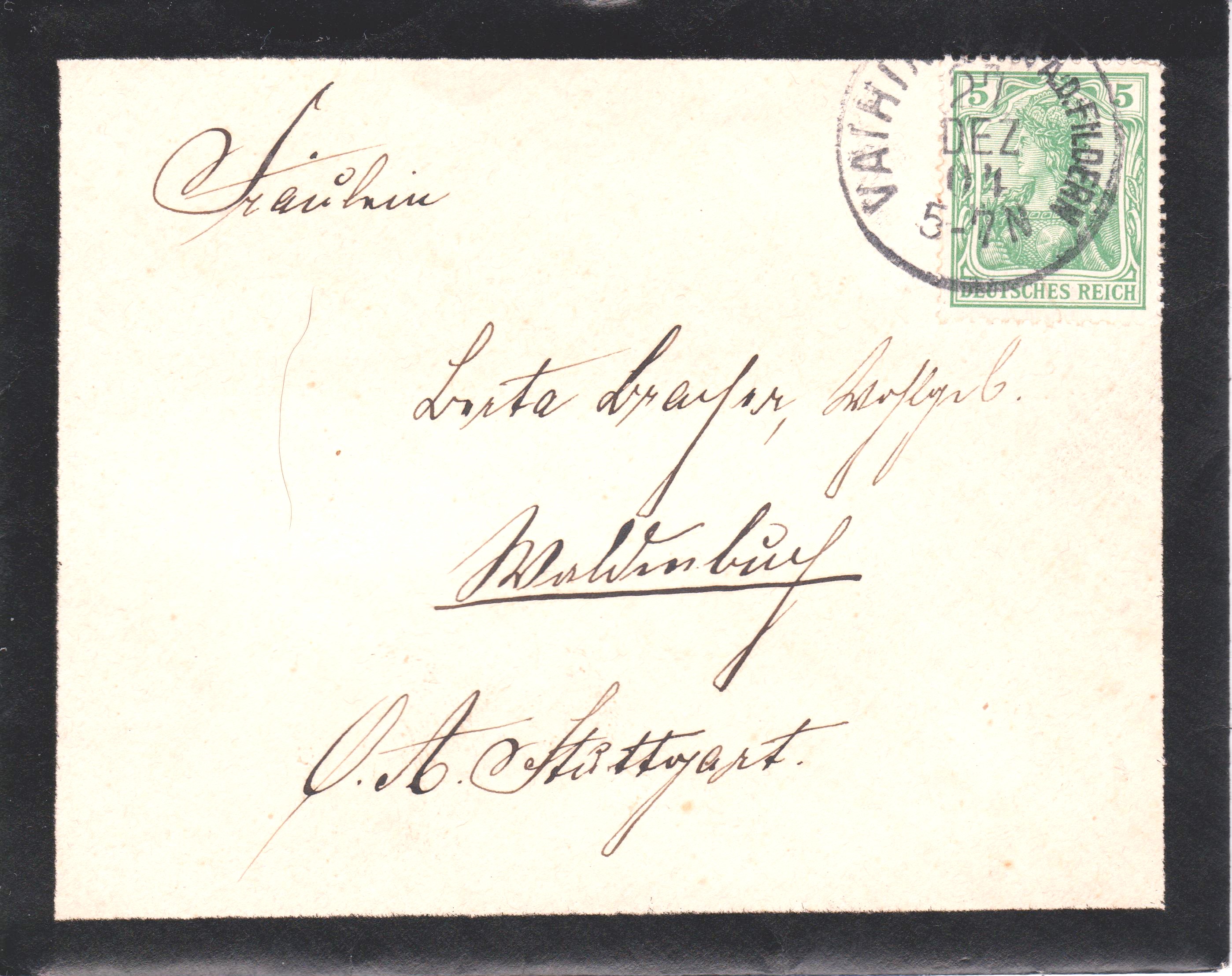 Trauerbrief, freigemacht mit 5 Pf Dauerserie Germania, gelaufen am 27.12.1904 im Fernverkehr ab VAIHINGEN:
