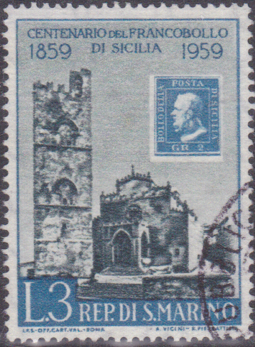 Ergänzend zu den bereits gezeigten Marke der Serie "100 Jahre Briefmarken von Sizilien" aus San Marino kann ich eine weitere Marke (MiNr 629) mit dem Dom von Erice und der Marke Sizilien MiNr 3.