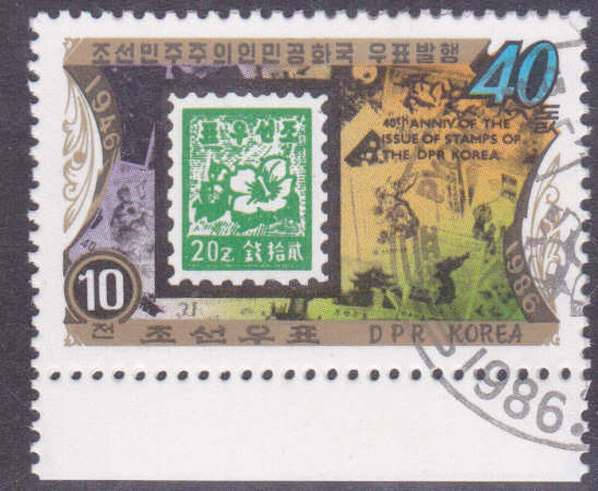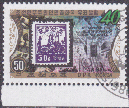 Aus Anlass "40 Jahre Briefmarken von Nordkorea" erschien in Korea-Nord diese Marke (MiNr 2767) mit der Marke Nordkorea MiNr 1.