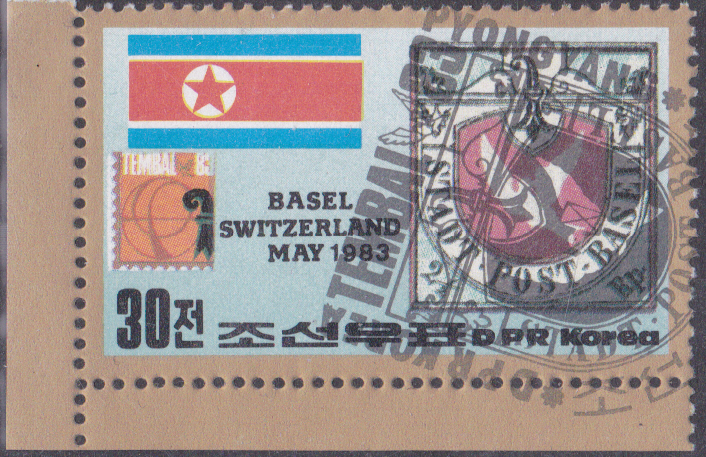 Zur Briefmarkenausstellung TEMBAL ’83 in Basel ist in Korea-Nord diese Marke (MiNr 2362) mit der Marke Basel MiNr 1. Diese Marke nennt man auch "Baseler Täubchen".