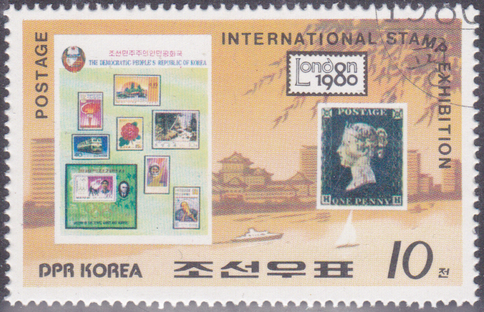 Aus der Serie aus Korea-Nord zur Internationalen Briefmarkenausstellung London 1980 zeige ich eine Marke (MiNr 1991) mit der Großbritannien MiNr 1 und einem Albumblatt mit verschiedenen Marken aus Nordkorea.