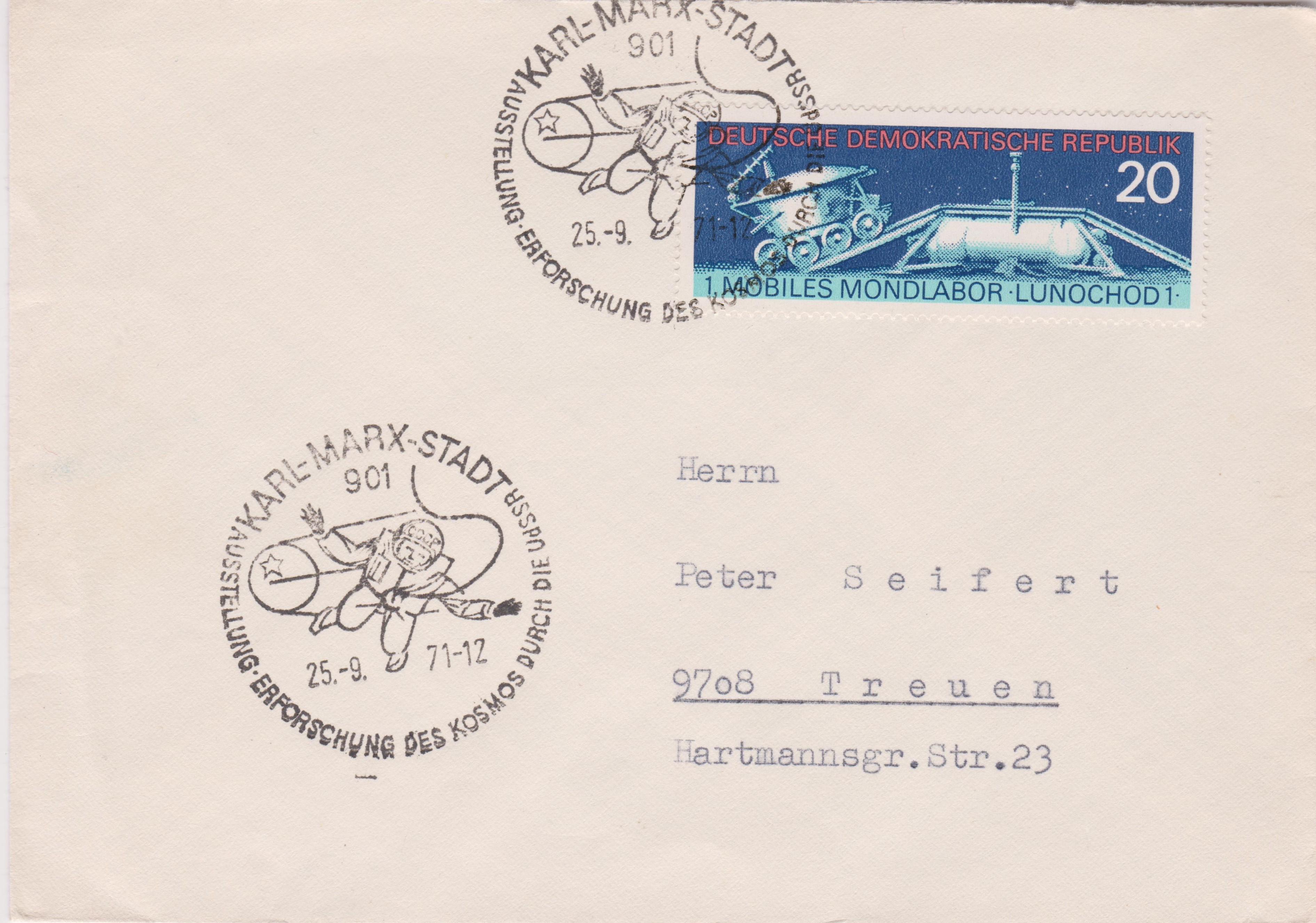 Brief, innerhalb der DDR gelaufen, adressiert nach "9708 Treuen", aufgegeben am 25.-9.71 in 901 KARL-MARX-STADT, mit Sonderstempel "AUSSTELLUNG ERFORSCHUNG DES KOSMOS DURCH DIE UdSSR":