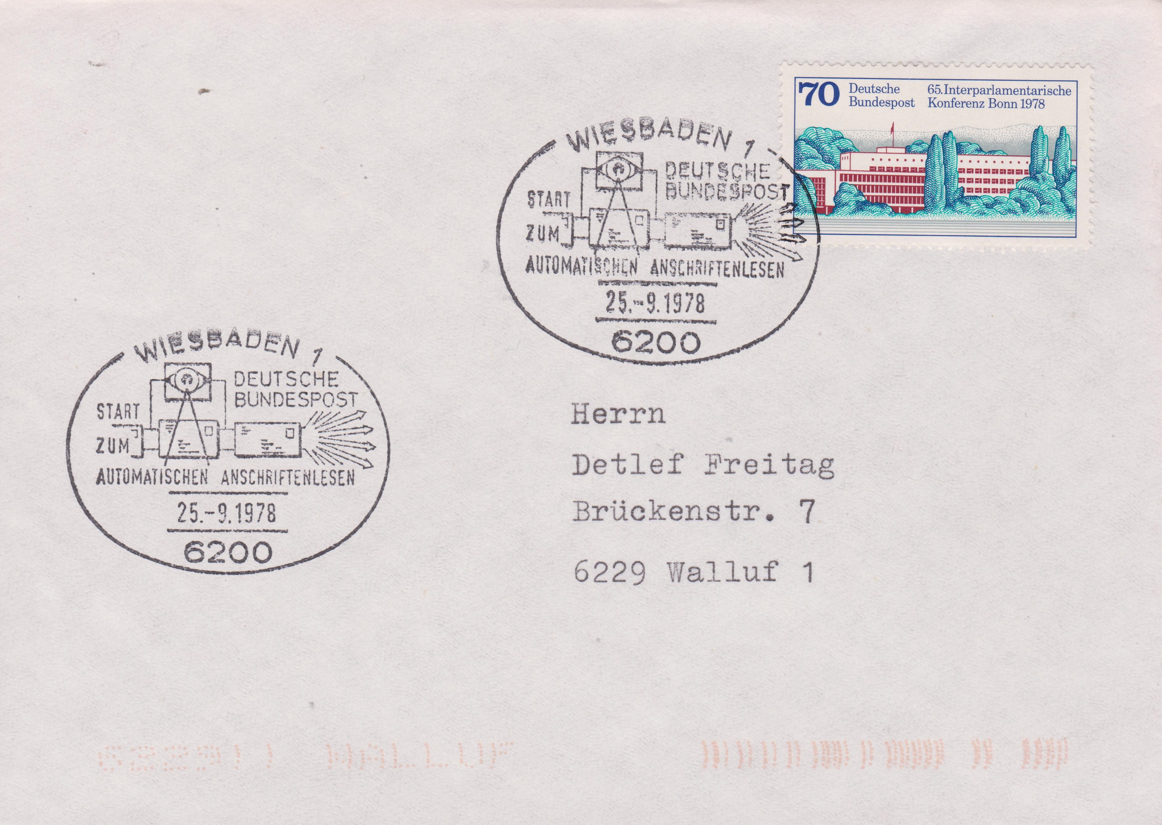 Brief mit Sonderstempel vom 25.09.1978 aus WIESBADEN 1 zum "START ZUM AUTOMATISCHEN ANSCHRIFTENLLESEN":