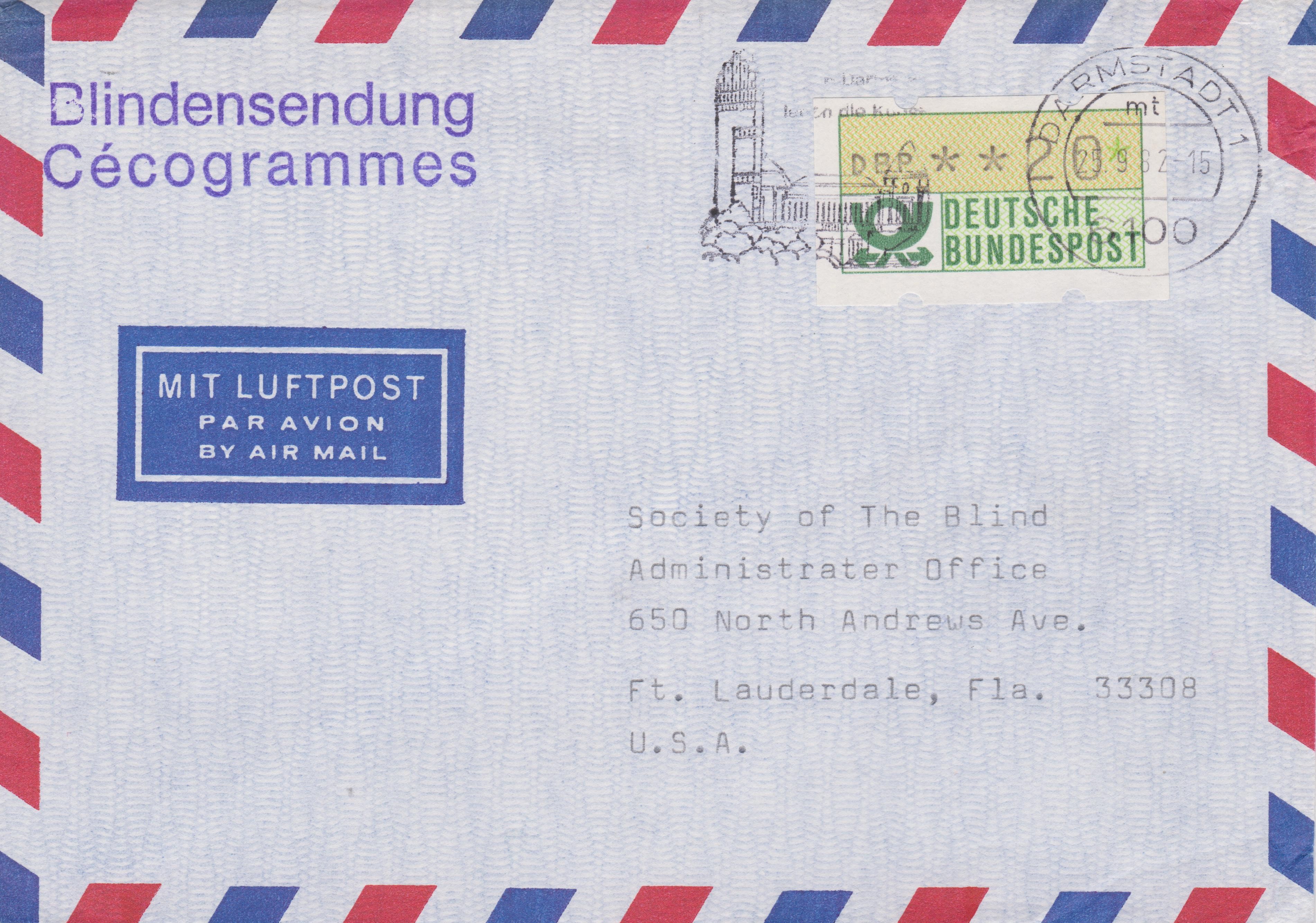 Für diese am 25.09.1982 in DARMSTADT aufgegebene portrofreie Blindensendung in die USA mußte lediglich das Porto in Höhe von 20 Pf für die Beförderung per Luftpost entrichtet werden, was mit einer Automatenmarke dieser Wertstufe erfolgte, die per Maschinenstempel entwertet wurde: