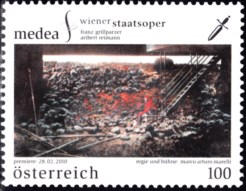 Zur Premiere der Oper "Medea" von Aribert Reimann in der Wiener Staatsoper erschien Österreich MiNr. 2857 mit einer Szene aus der Oper "Medea".