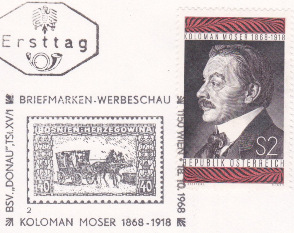 In diesem Sonderstempel aus Wien vom 18.10.1968 am Ausgabetag der Marke zum 50. Todestag von Koloman Moser (1868 - 1918) wird eine Marke aus Bosnien-Herzegowina (MiNr 39) gezeigt, die von Moser entworfen wurde.